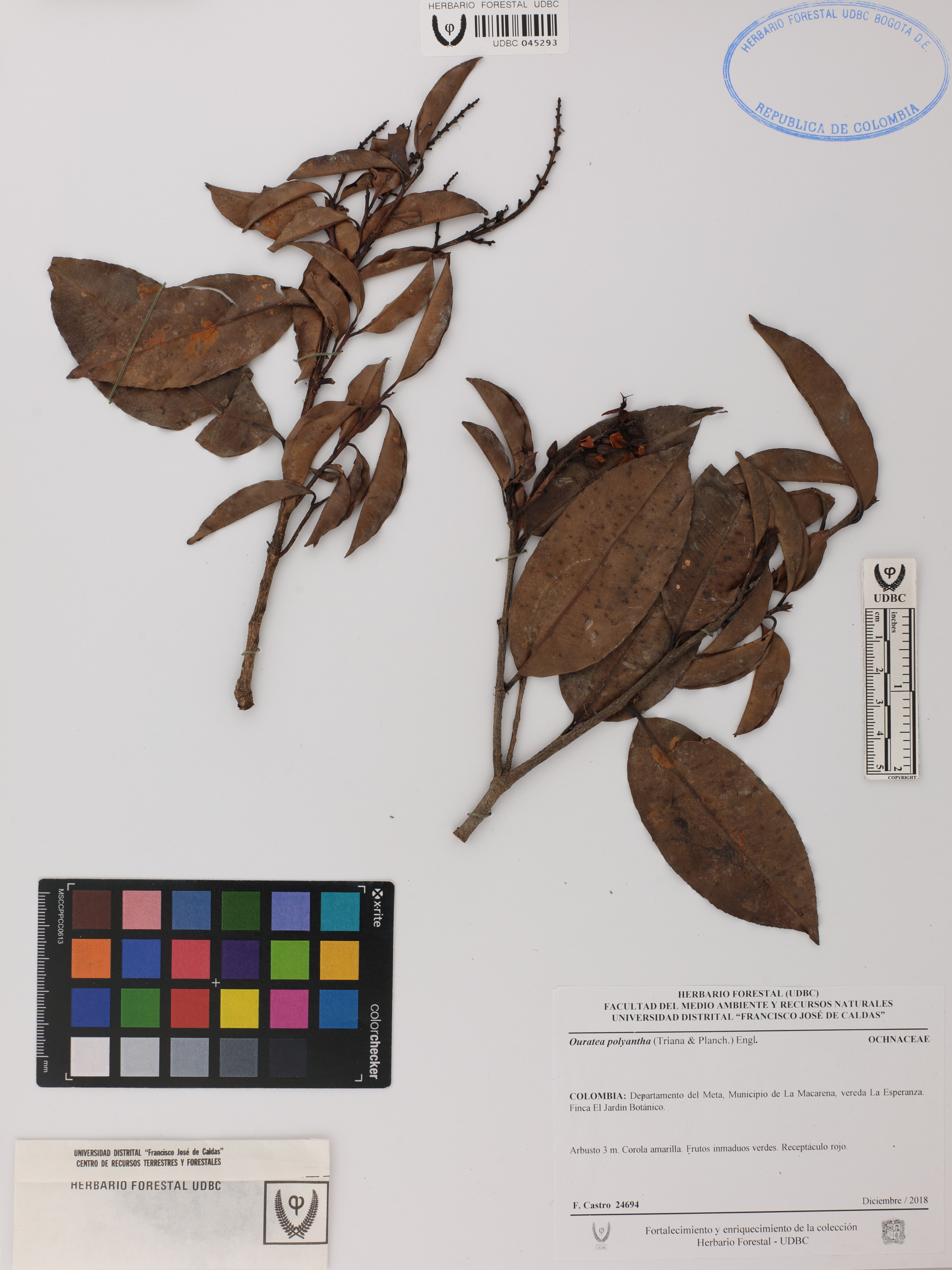 Fotografía del ejemplar Castro, F. 24694, determinado como Ouratea polyantha en el año 2018