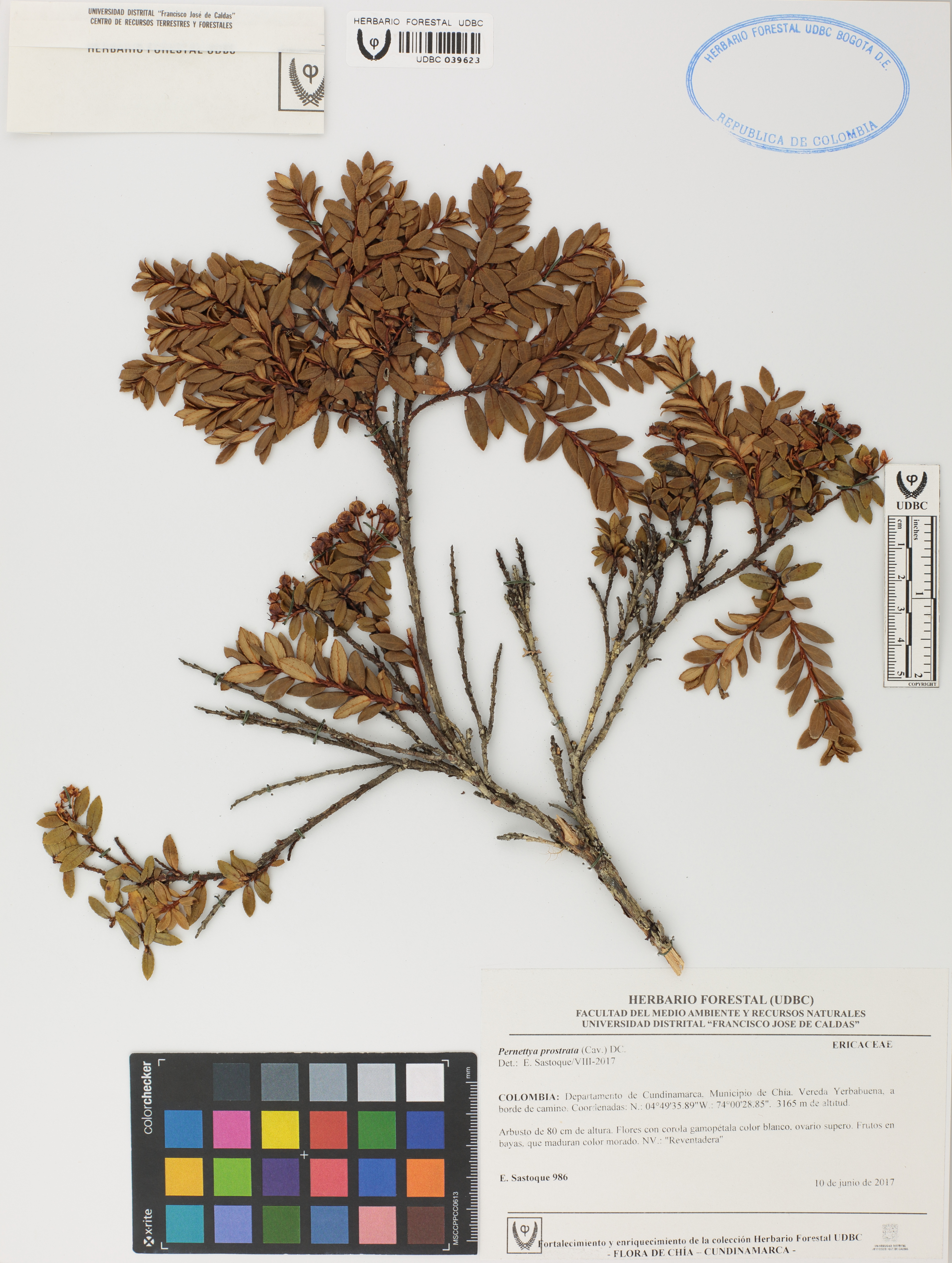 Fotografía del ejemplar Sastoque, E. 986, determinado como Pernettya prostrata en el año 2017