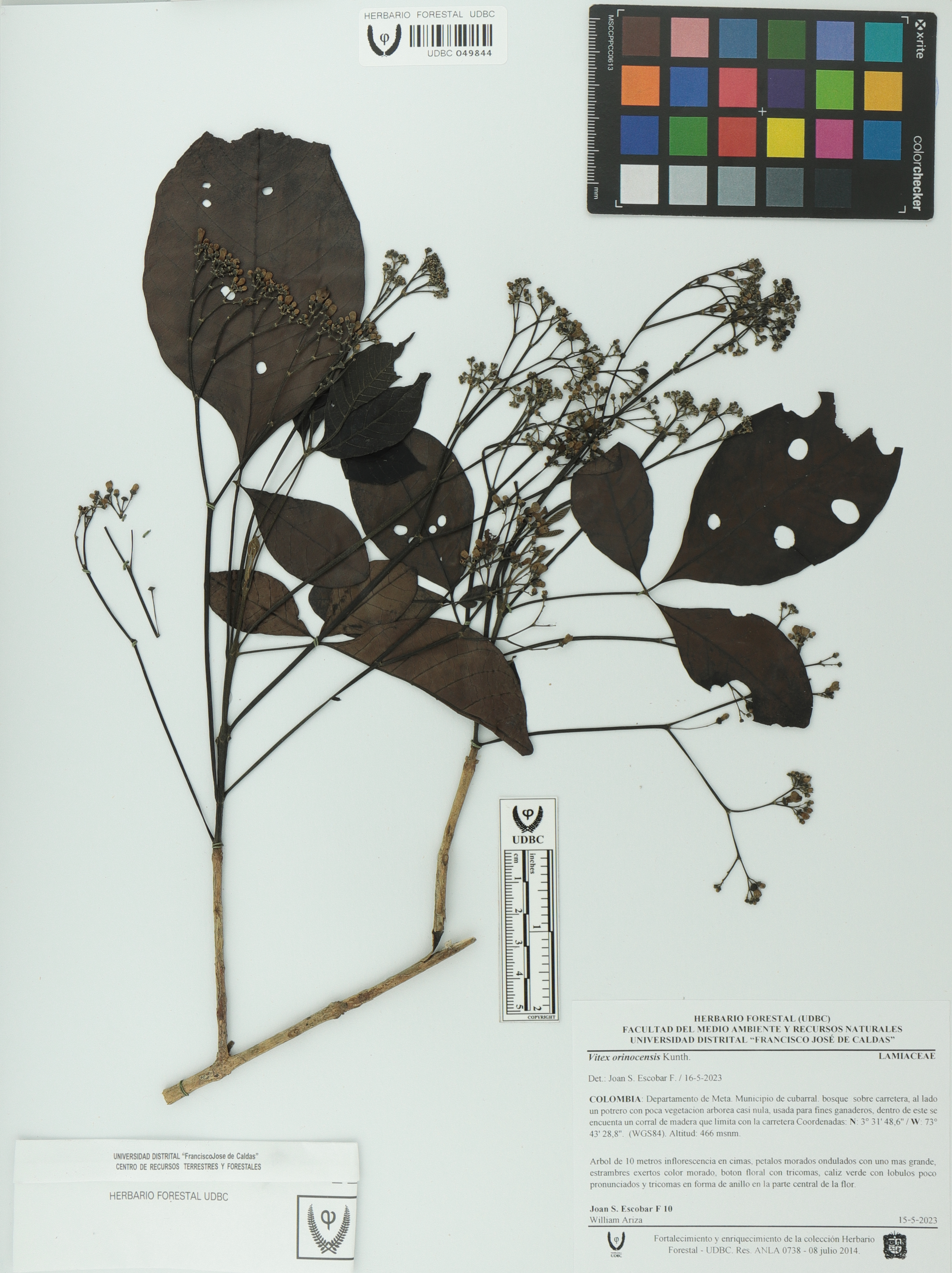 Fotografía del ejemplar Escobar, J. 10, determinado como Vitex orinocensis en el año 2023