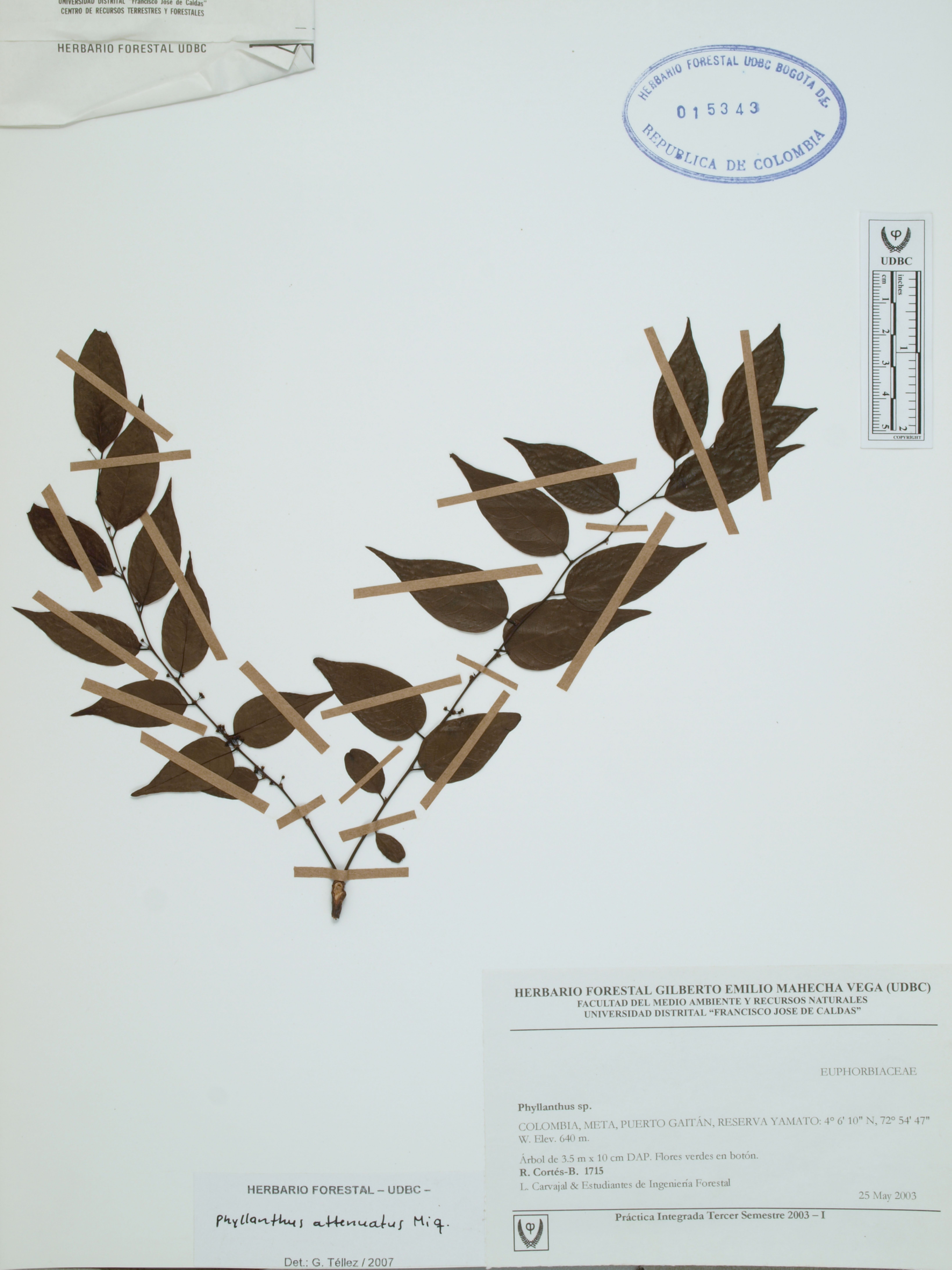Fotografía del ejemplar Cortés-B., R. 1715, determinado como Phyllanthus attenuatus en el año 2007