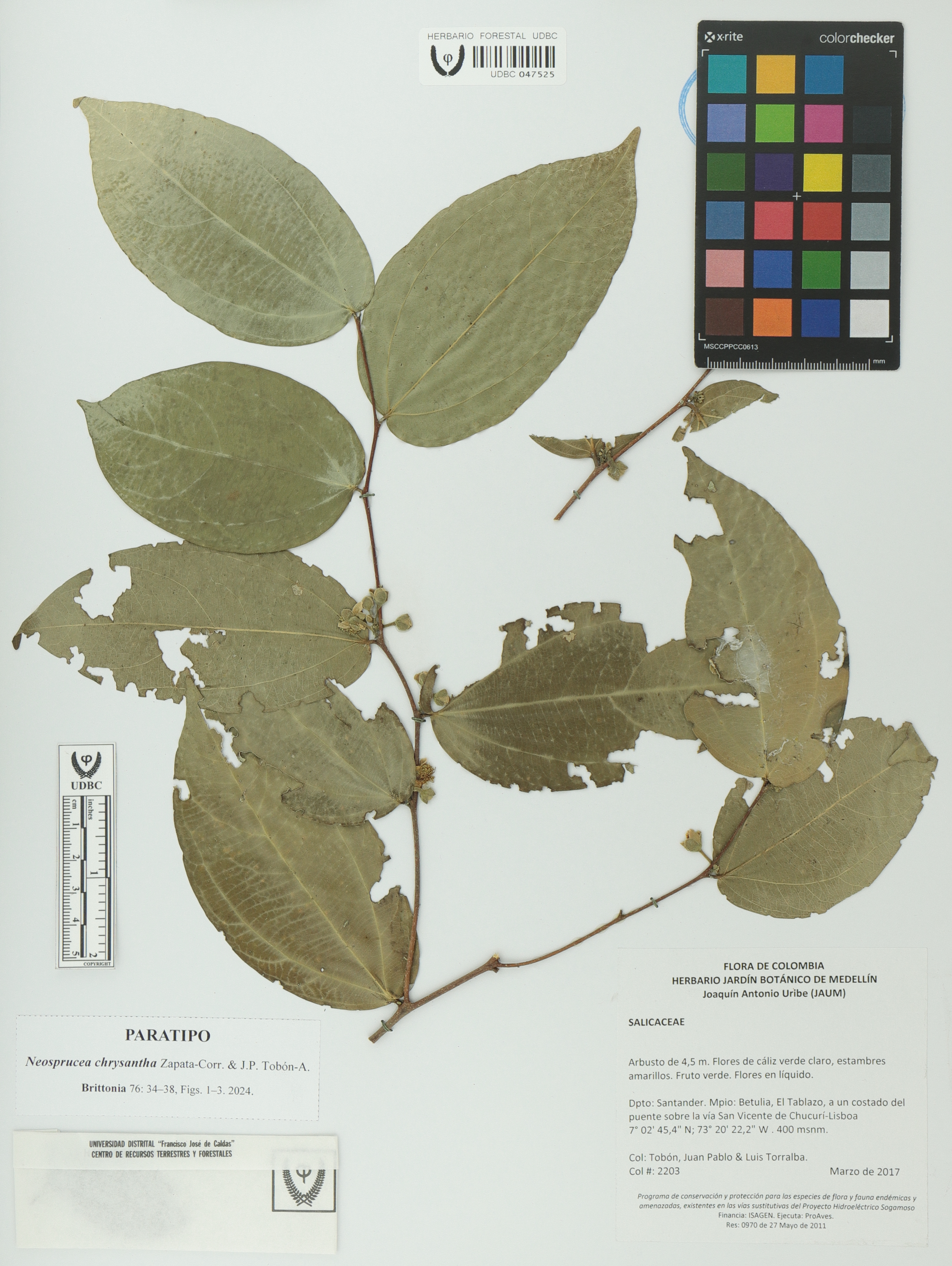 | dc.description | Fotografía del ejemplar Tobón-A., J. 2203, Paratipo de Neosprucea chrysantha | |