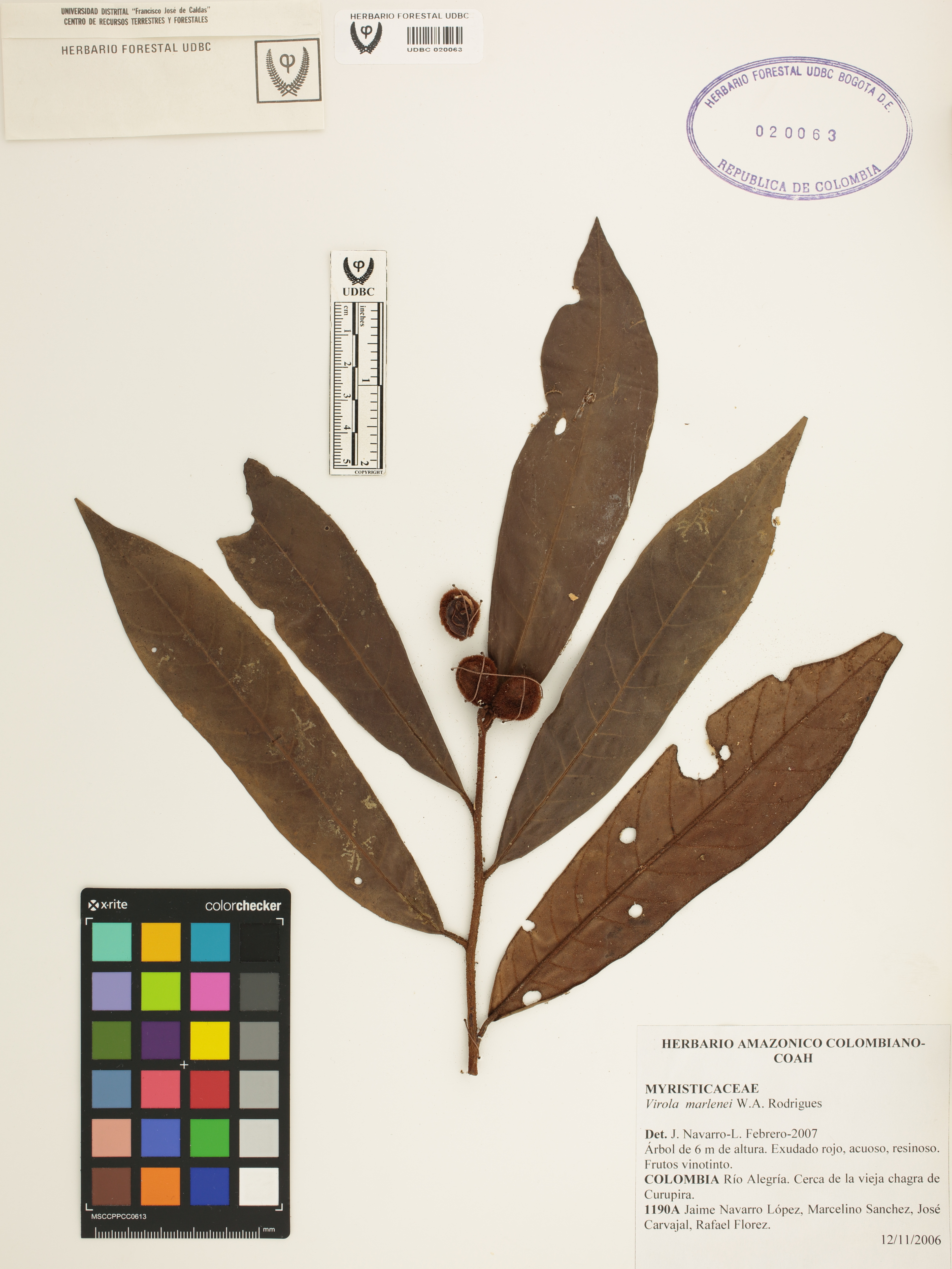 Fotografía del ejemplar Navarro, J. 1190A, determinado como Virola marlenei en el año 2007