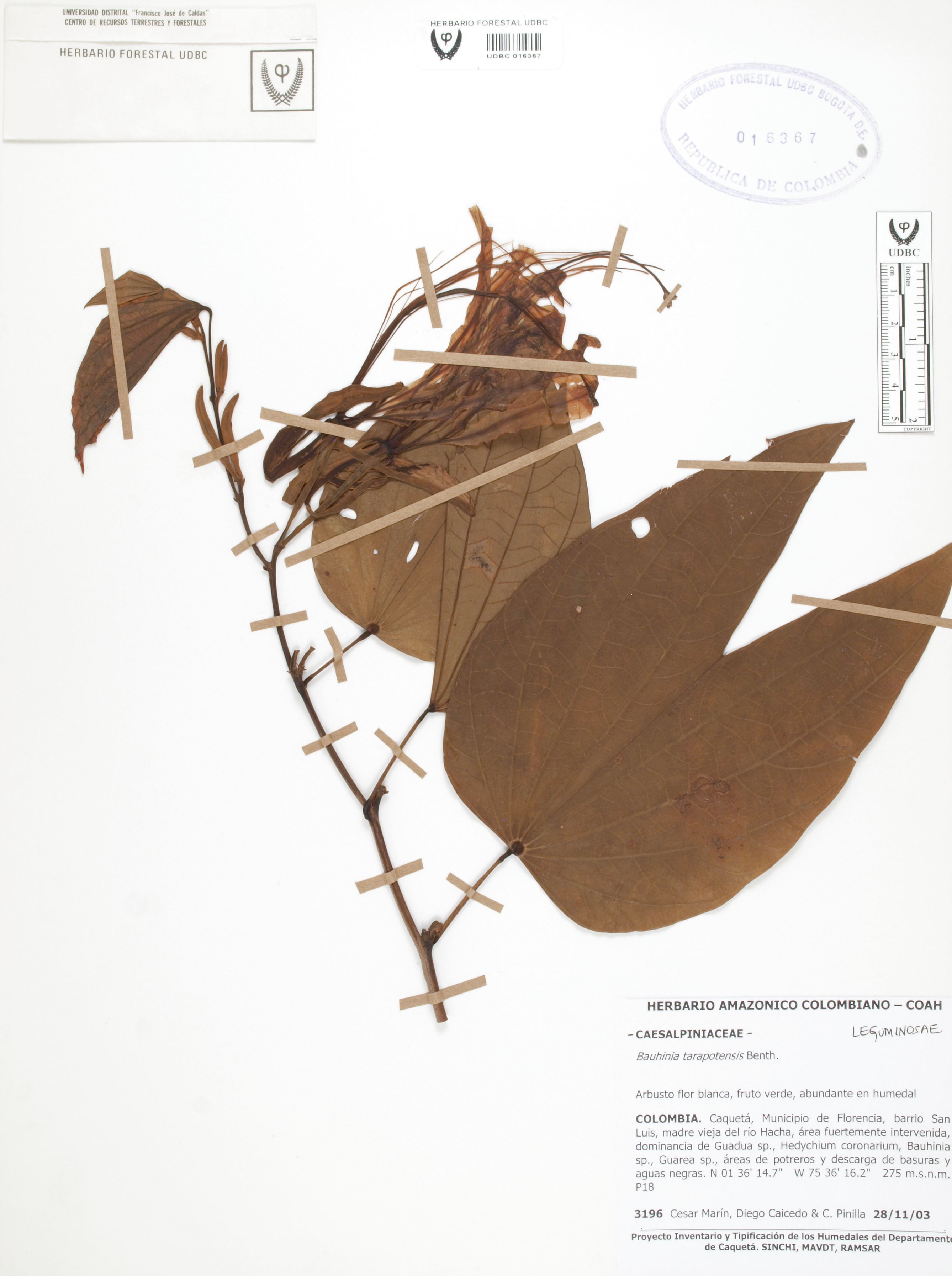 Fotografía del ejemplar Marín, C. 3196, determinado como Bauhinia tarapotensis