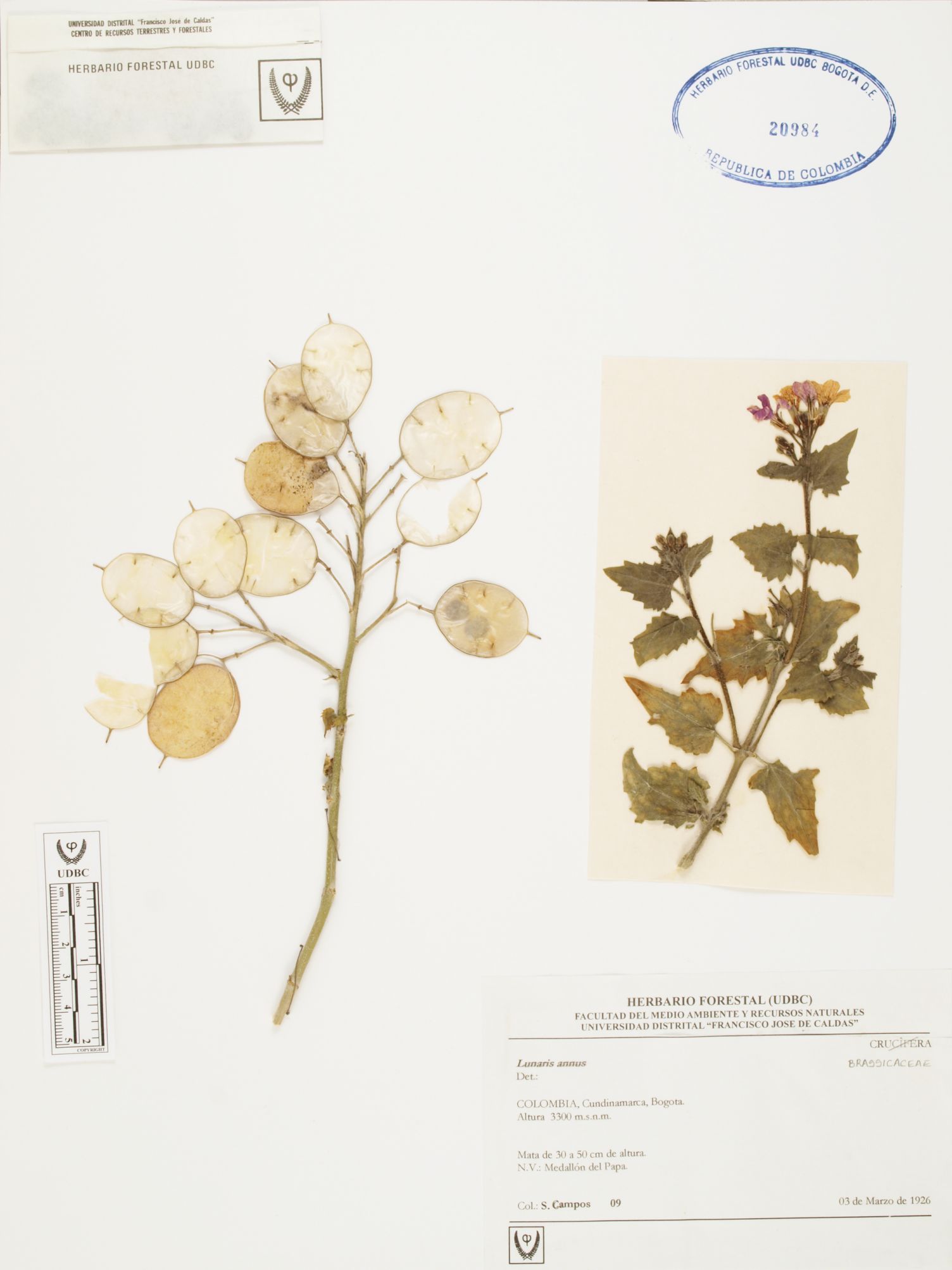 Fotografía del ejemplar Campos, S. 9, determinado como Lunaria annua