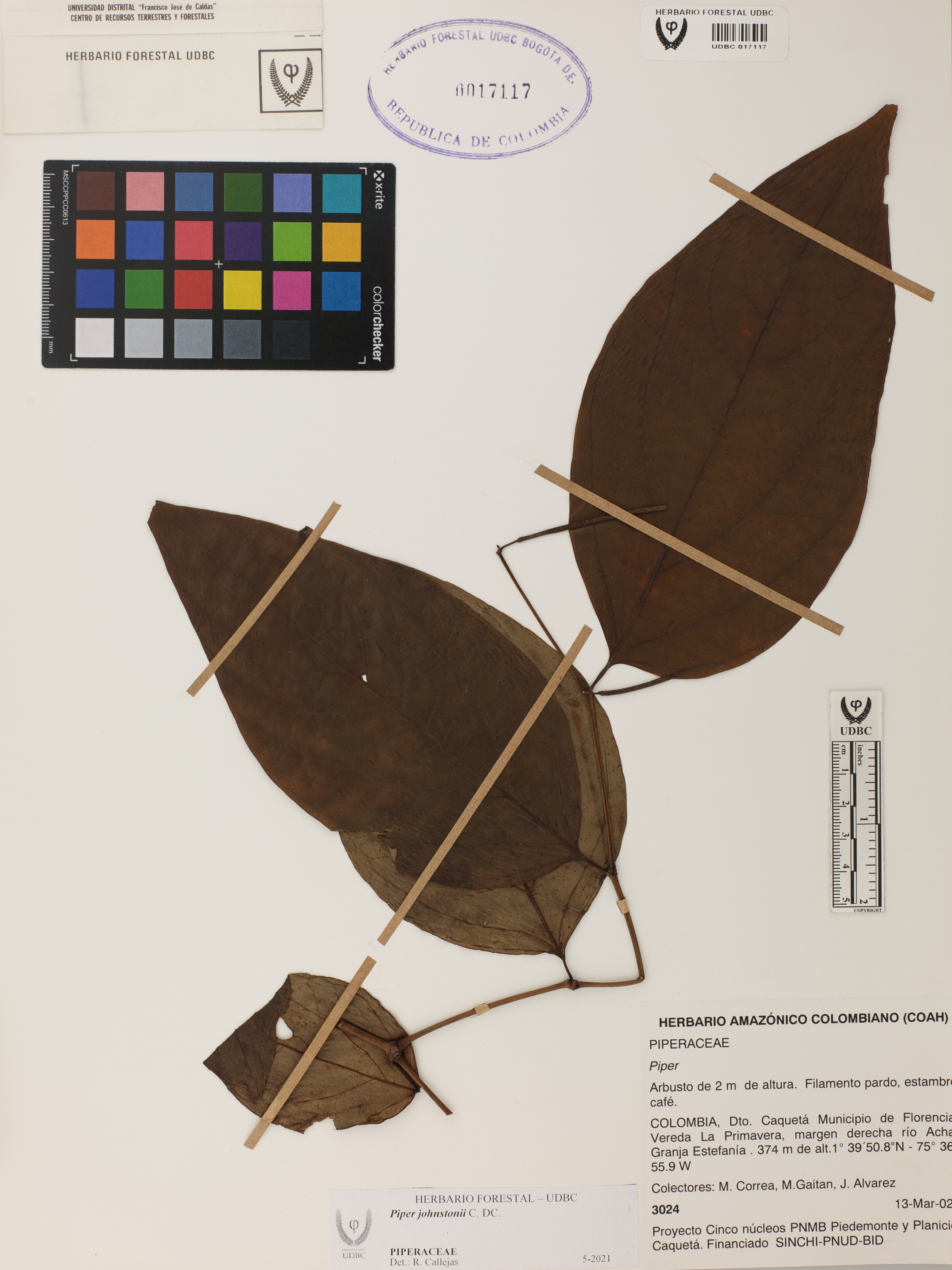 Fotografía del ejemplar Correa, M. 3024, determinado como Piper johnstonii en el año 2021