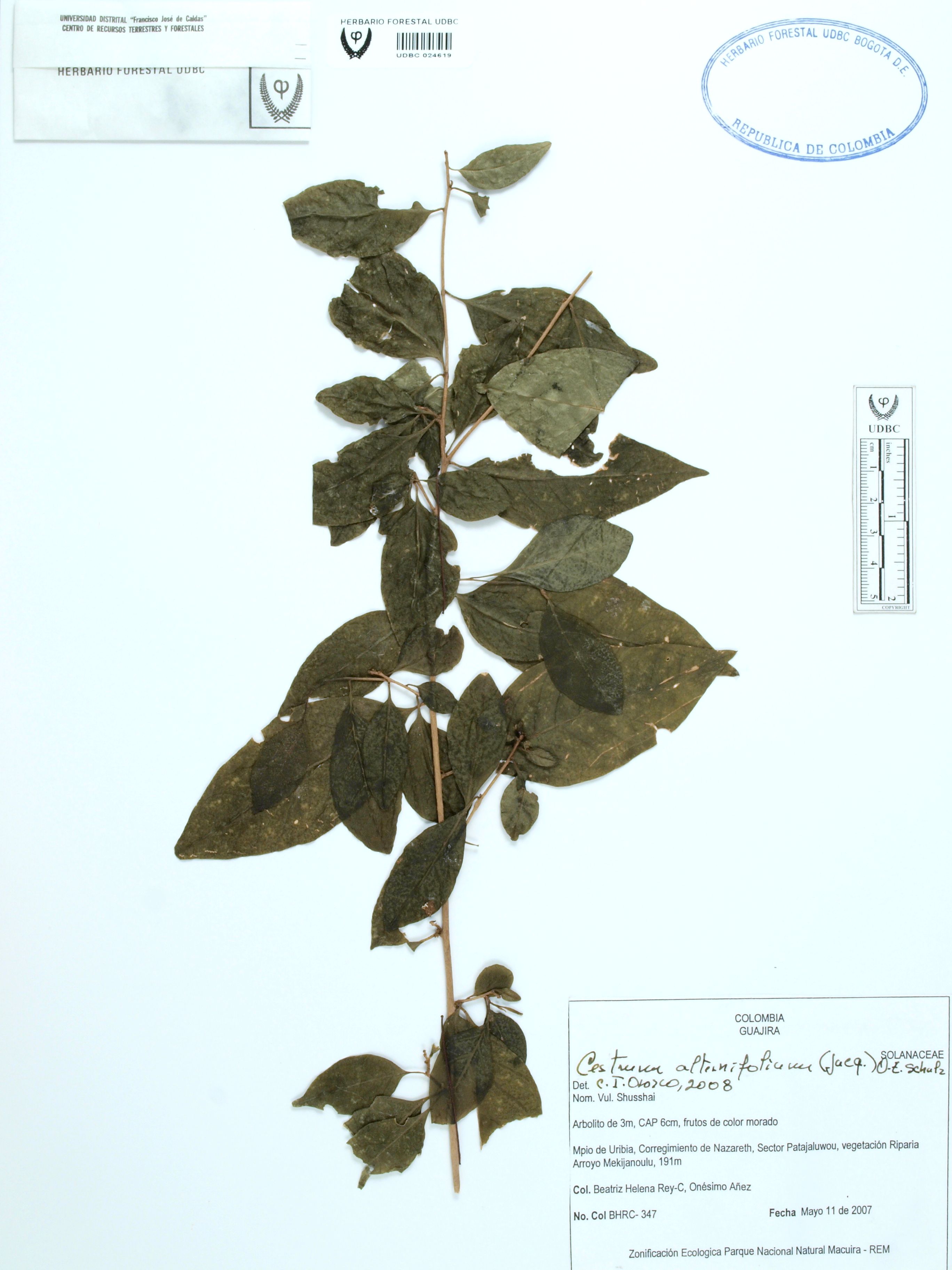 Fotografía del ejemplar Rey-C., B. 347, determinado como Cestrum alternifolium en el año 2008