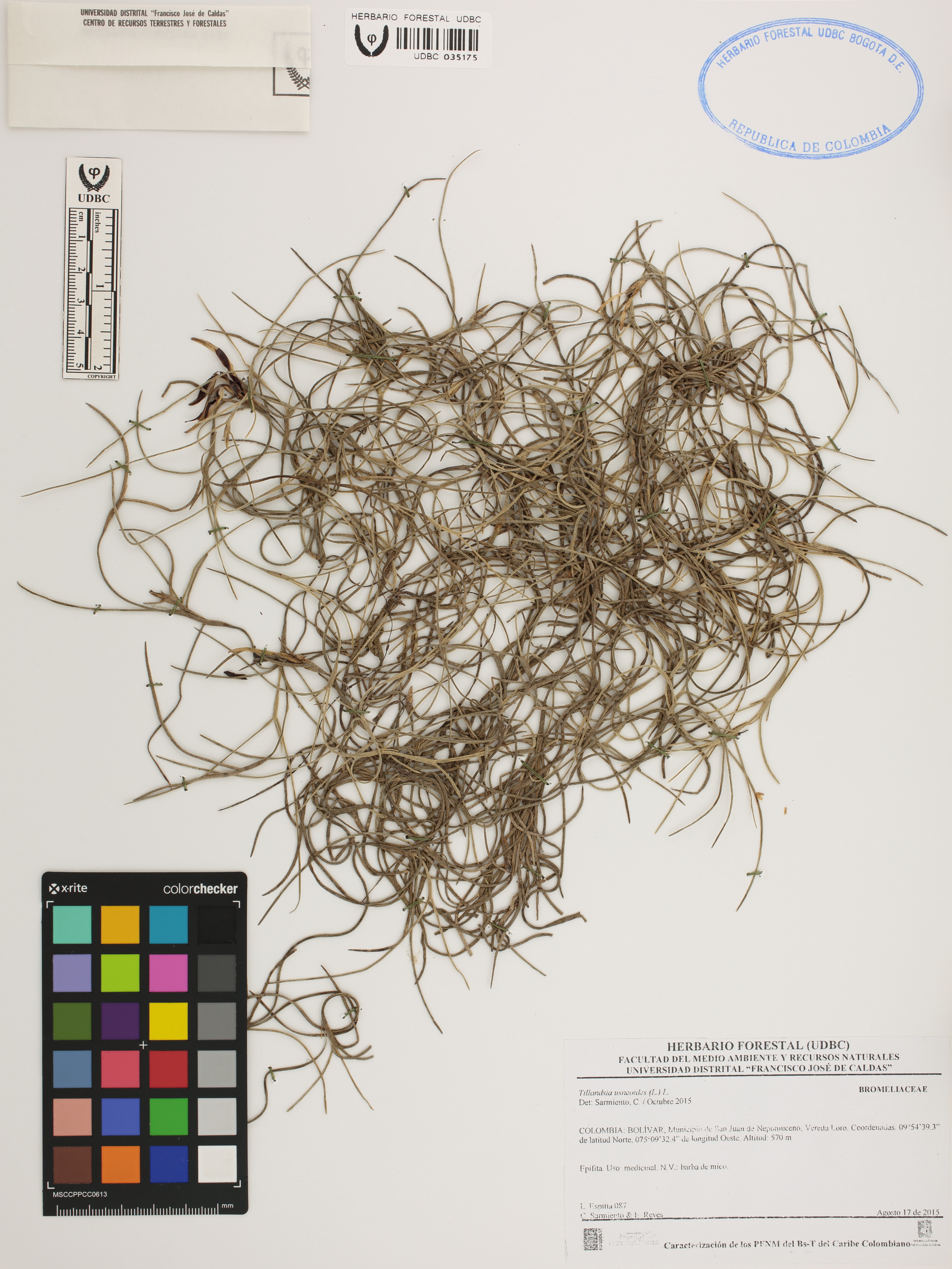Fotografía del ejemplar Espitia, L. 87, determinado como Tillandsia usneoides en el año 2015