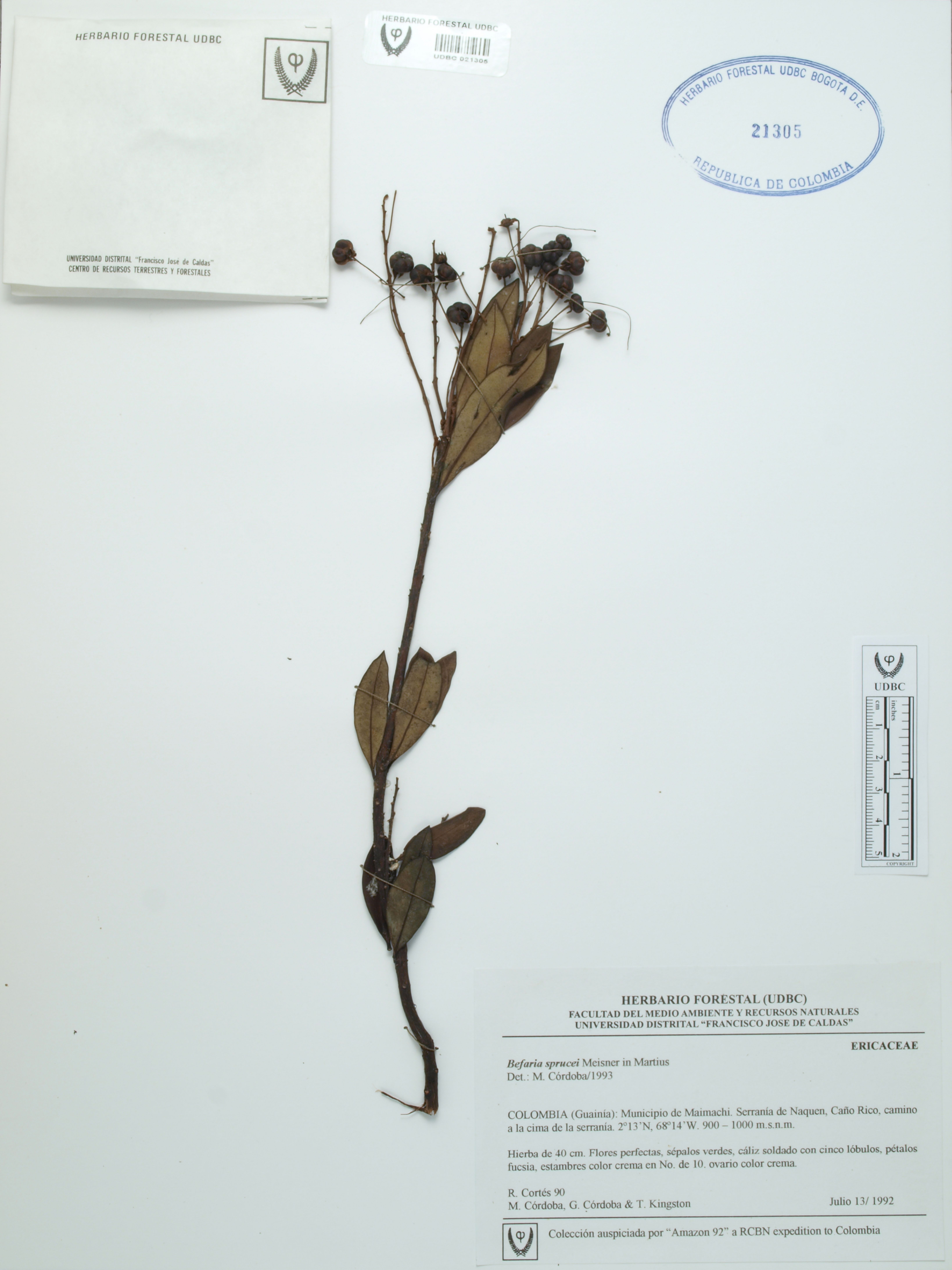 Fotografía del ejemplar Cortés-B., R. 90, determinado como Bejaria sprucei en el año 1993