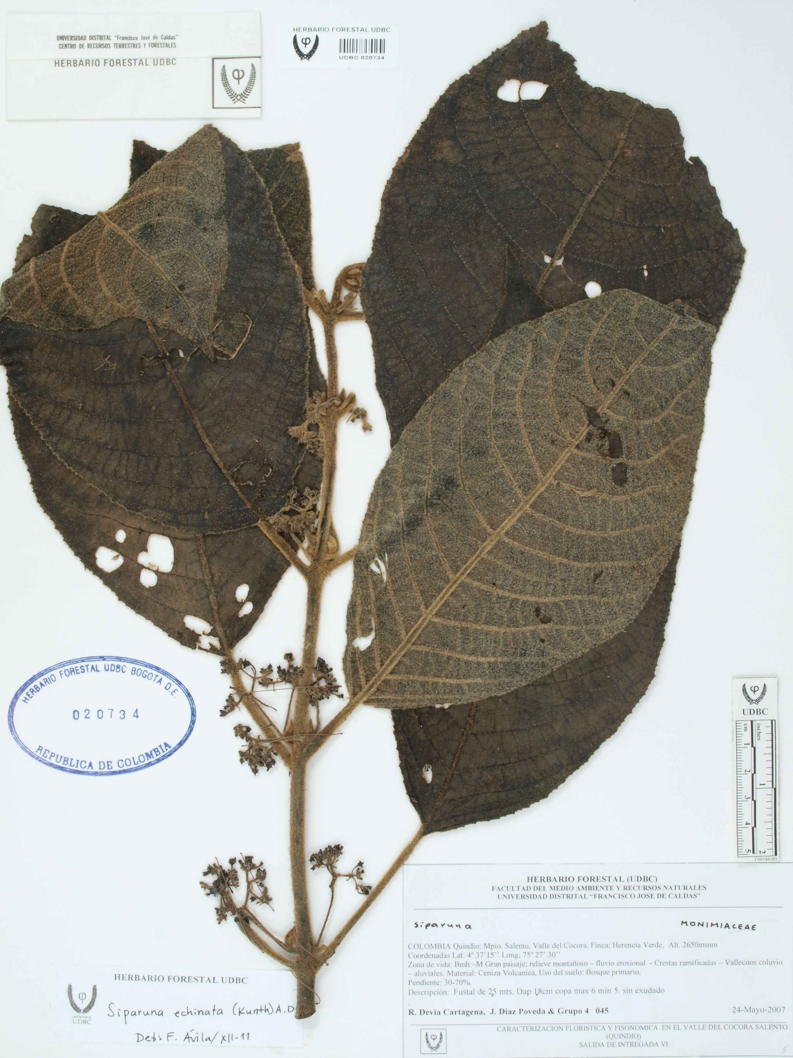 | dc.description | Fotografía del ejemplar Devia, R. 45, determinado como Siparuna echinata en el año 2011 | |