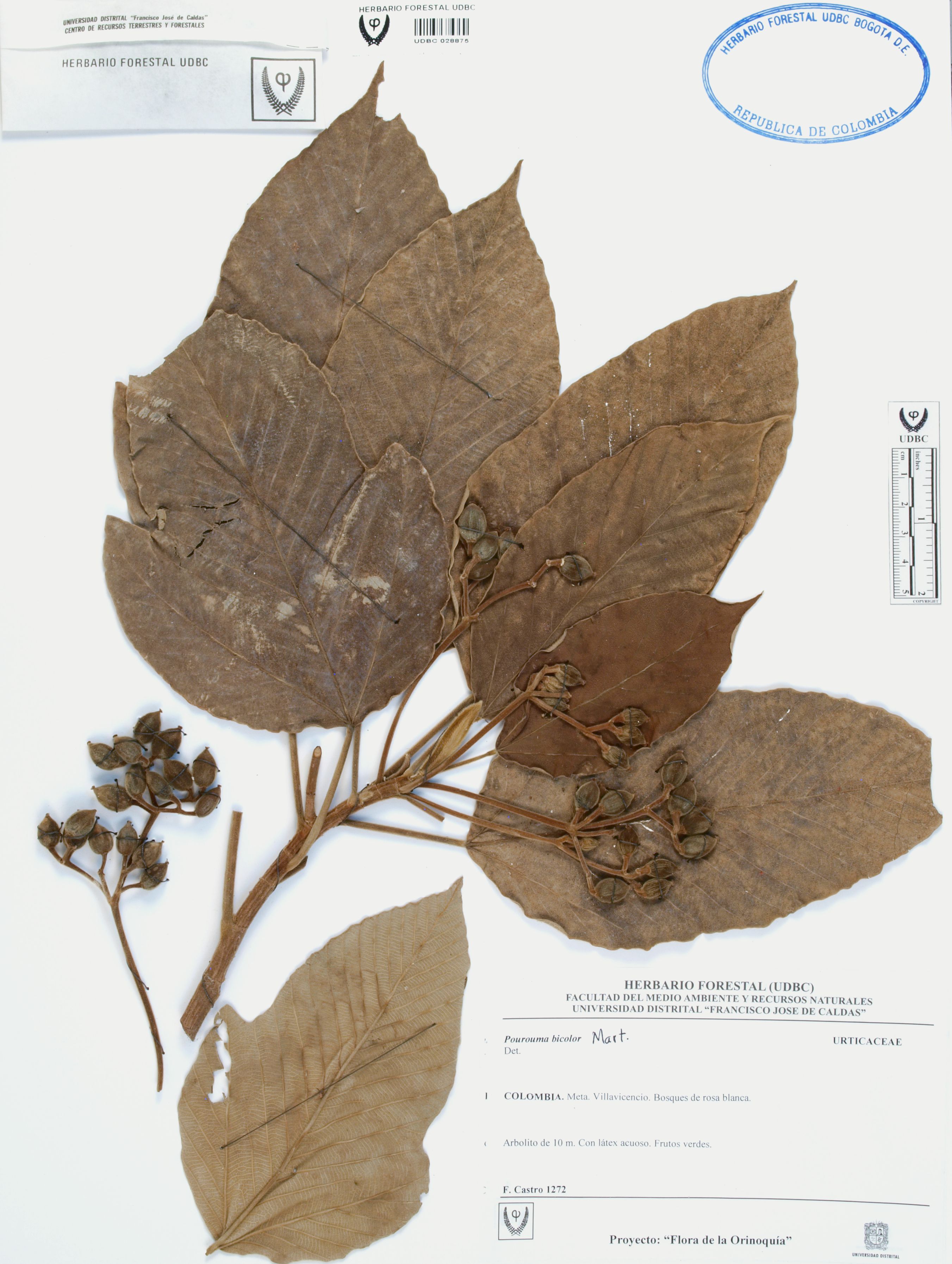 Fotografía del ejemplar Castro, F. 1272, determinado como Pourouma bicolor