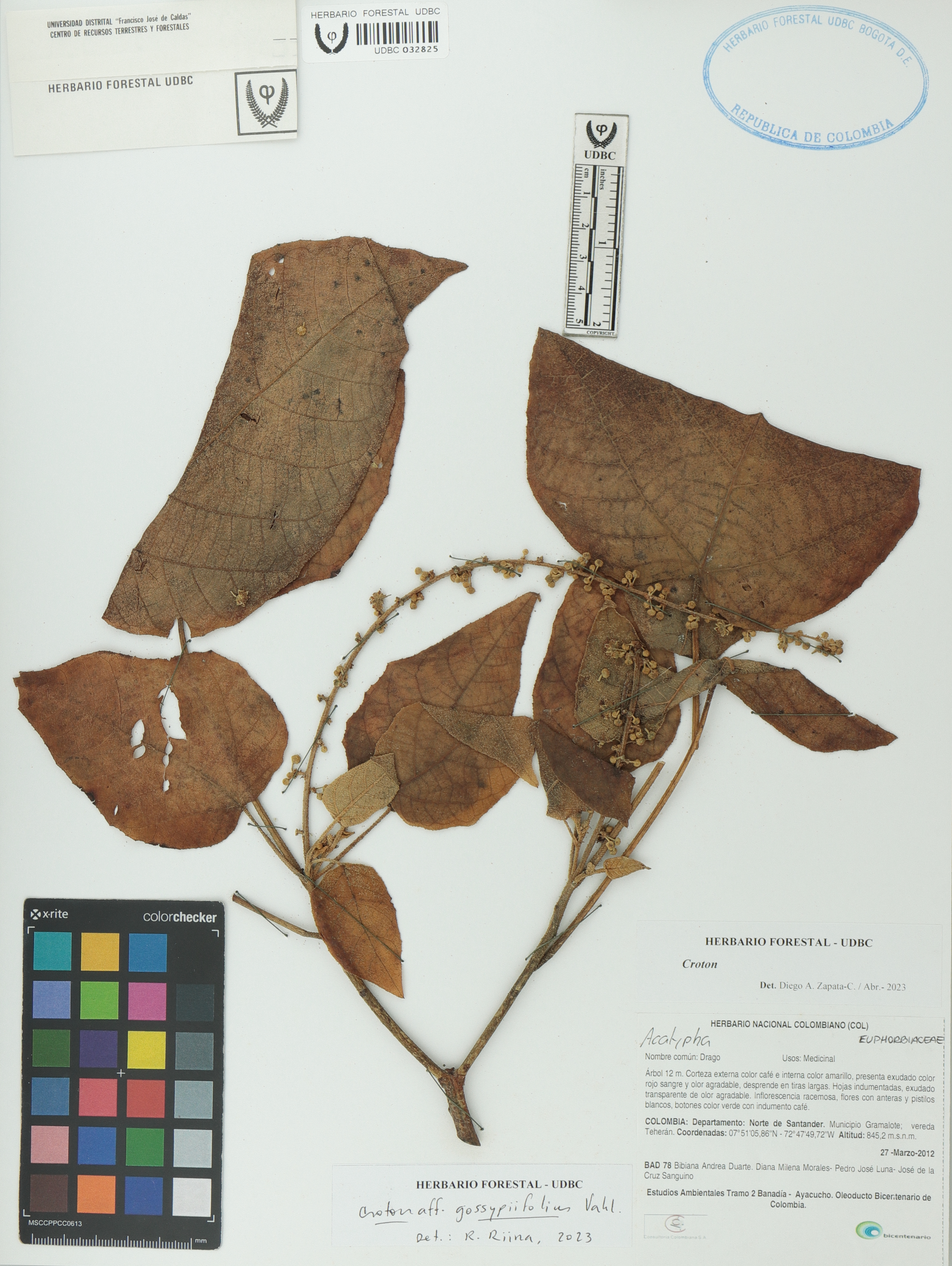 Fotografía del ejemplar Duarte, B. 78, determinado como Croton gossypiifolius en el año 2023