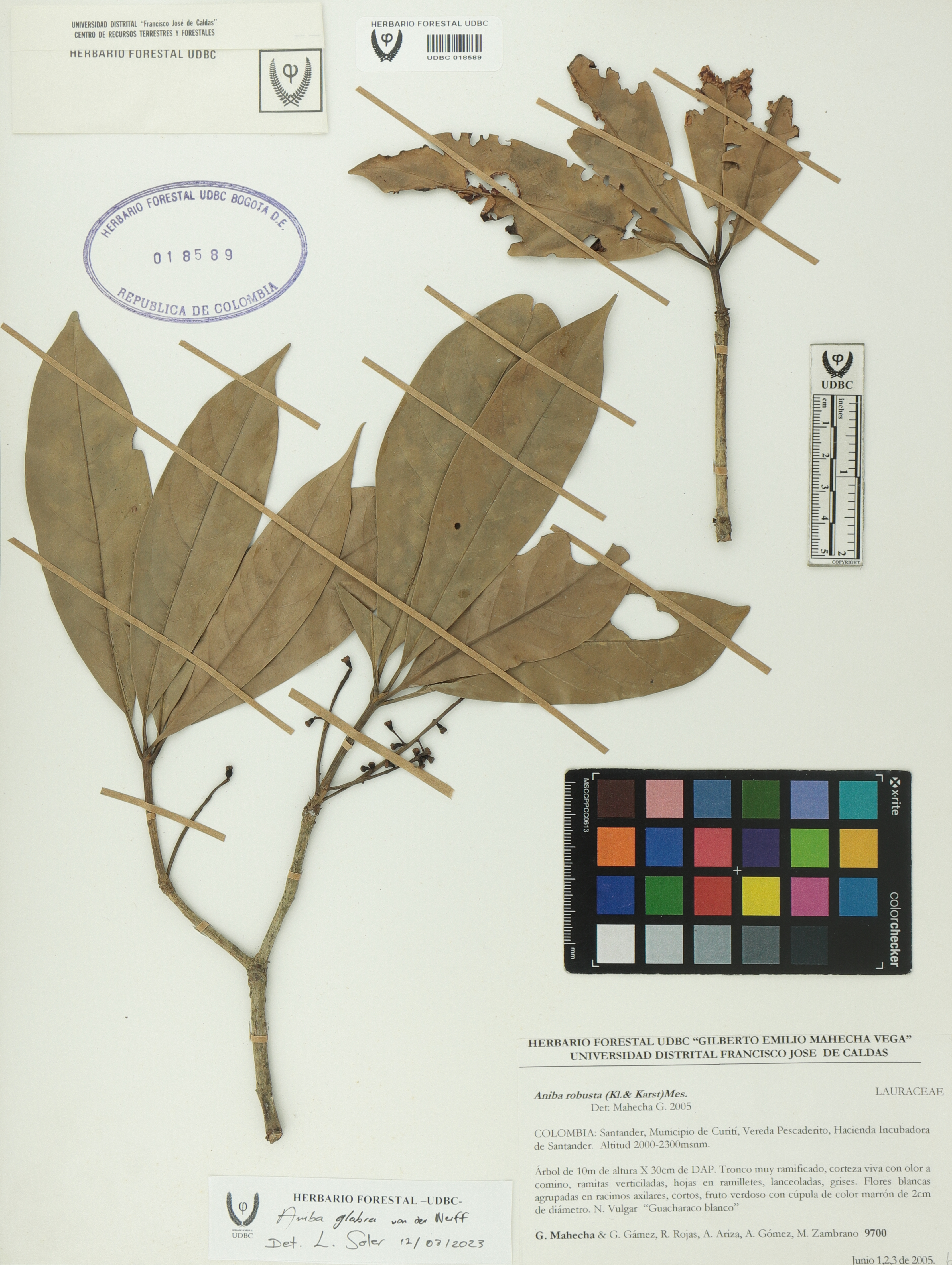 Fotografía del ejemplar Mahecha, G. 9700, determinado como Aniba glabra en el año 2024