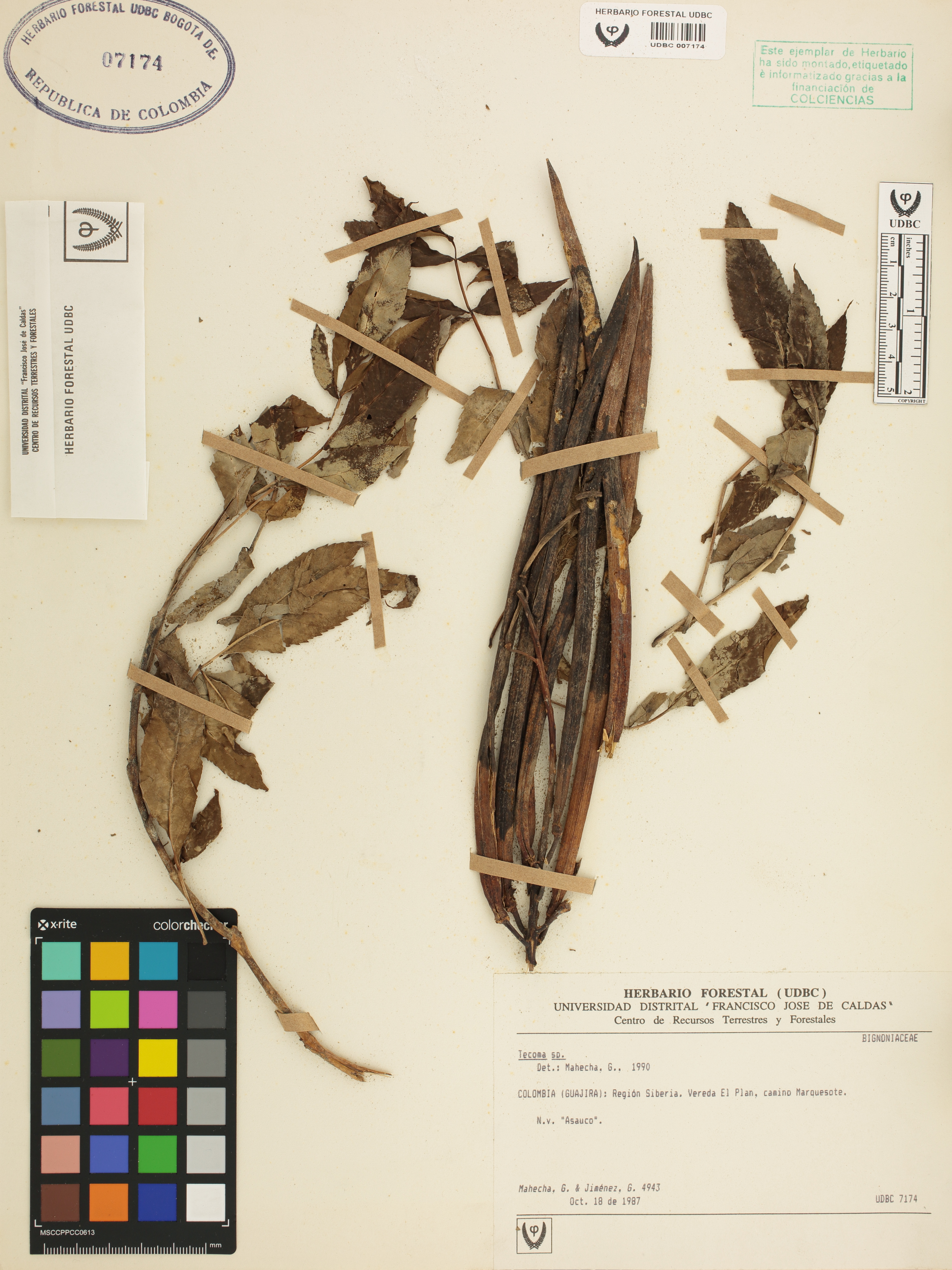Fotografía del ejemplar Mahecha, G. 4943, determinado como Tecoma sp. en el año 1990