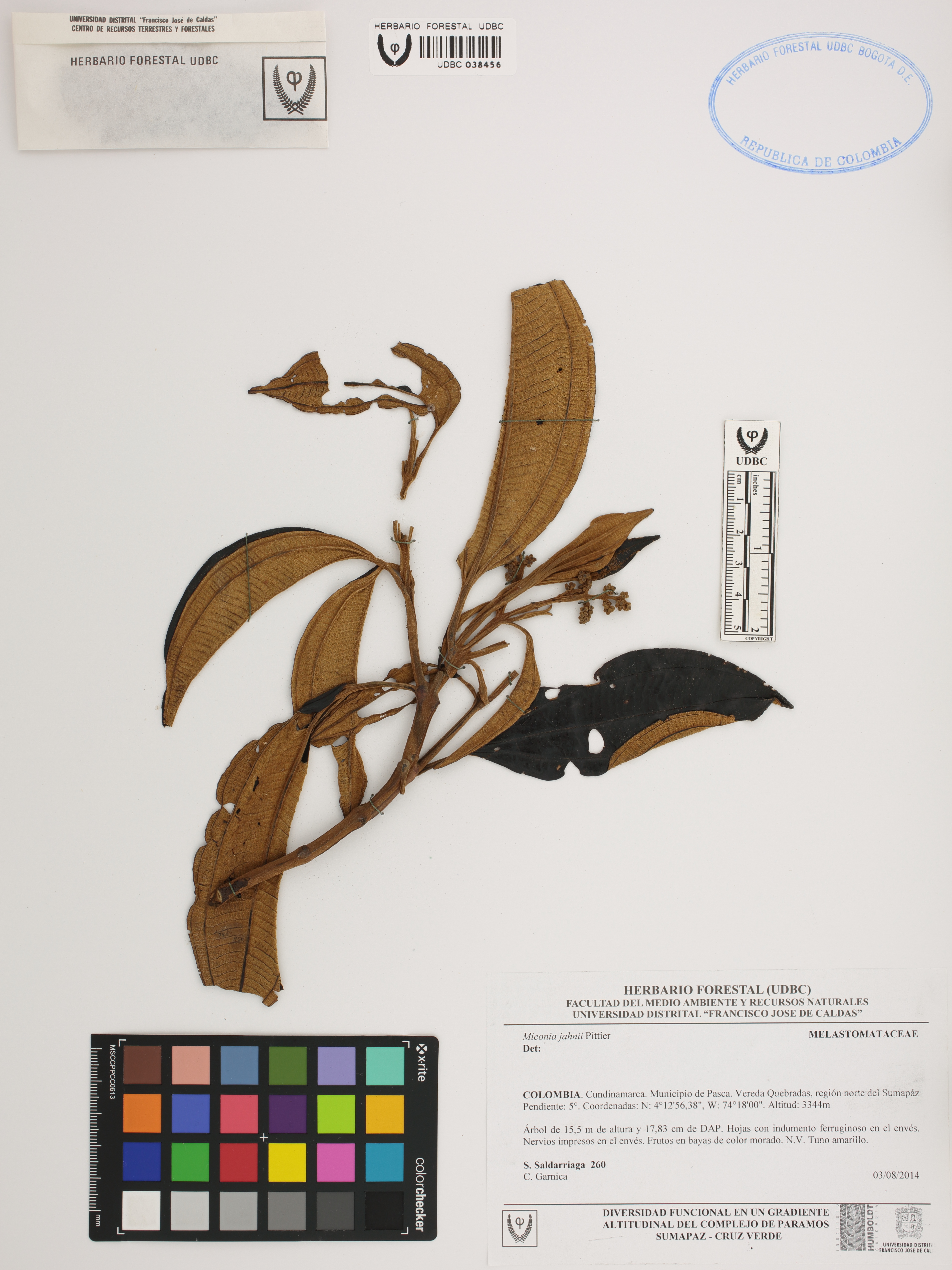 Fotografía del ejemplar Saldarriaga, S. 260, determinado como Miconia jahnii