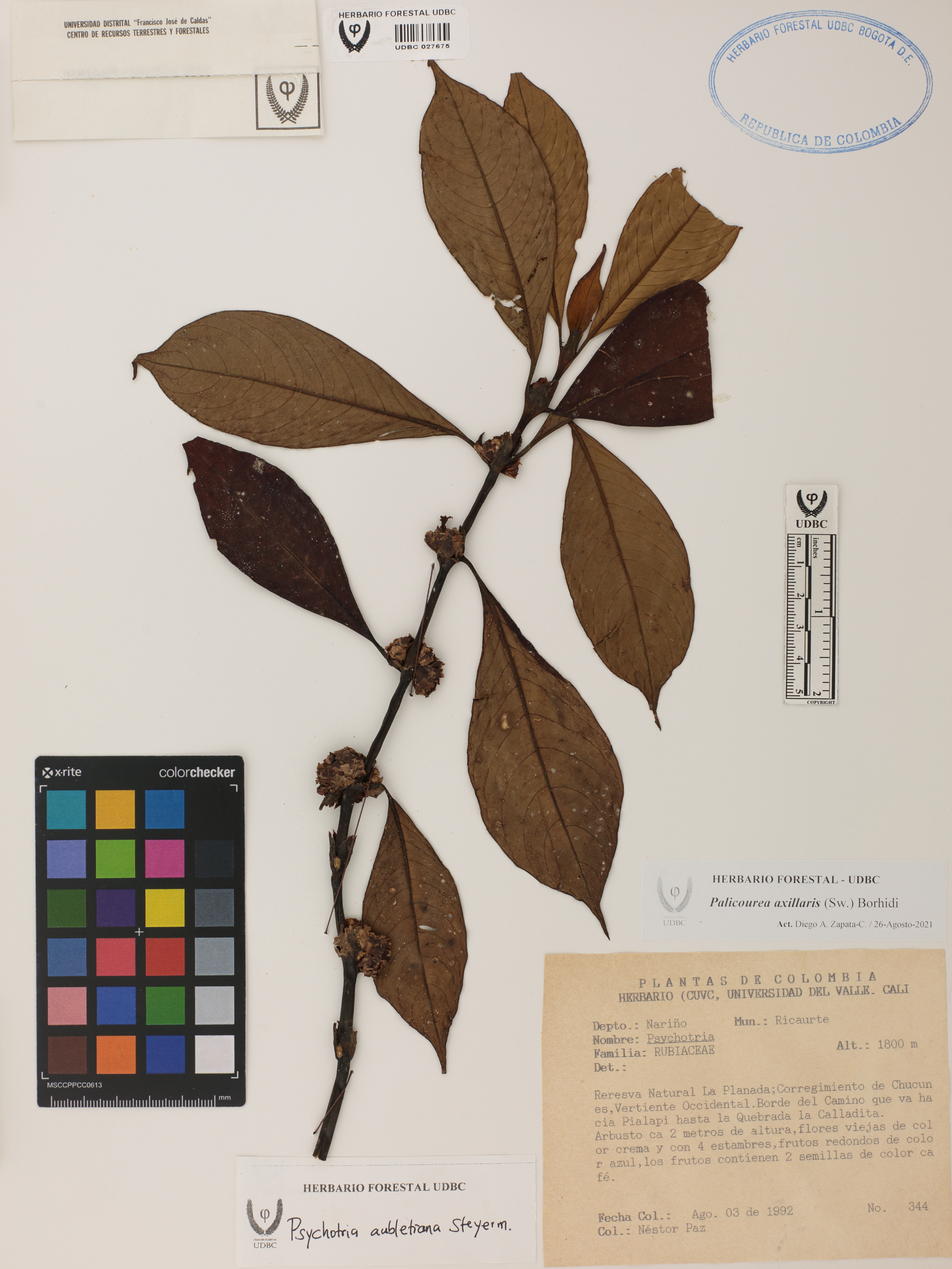 Fotografía del ejemplar Paz, N. 344, determinado como Palicourea axillaris en el año 1992