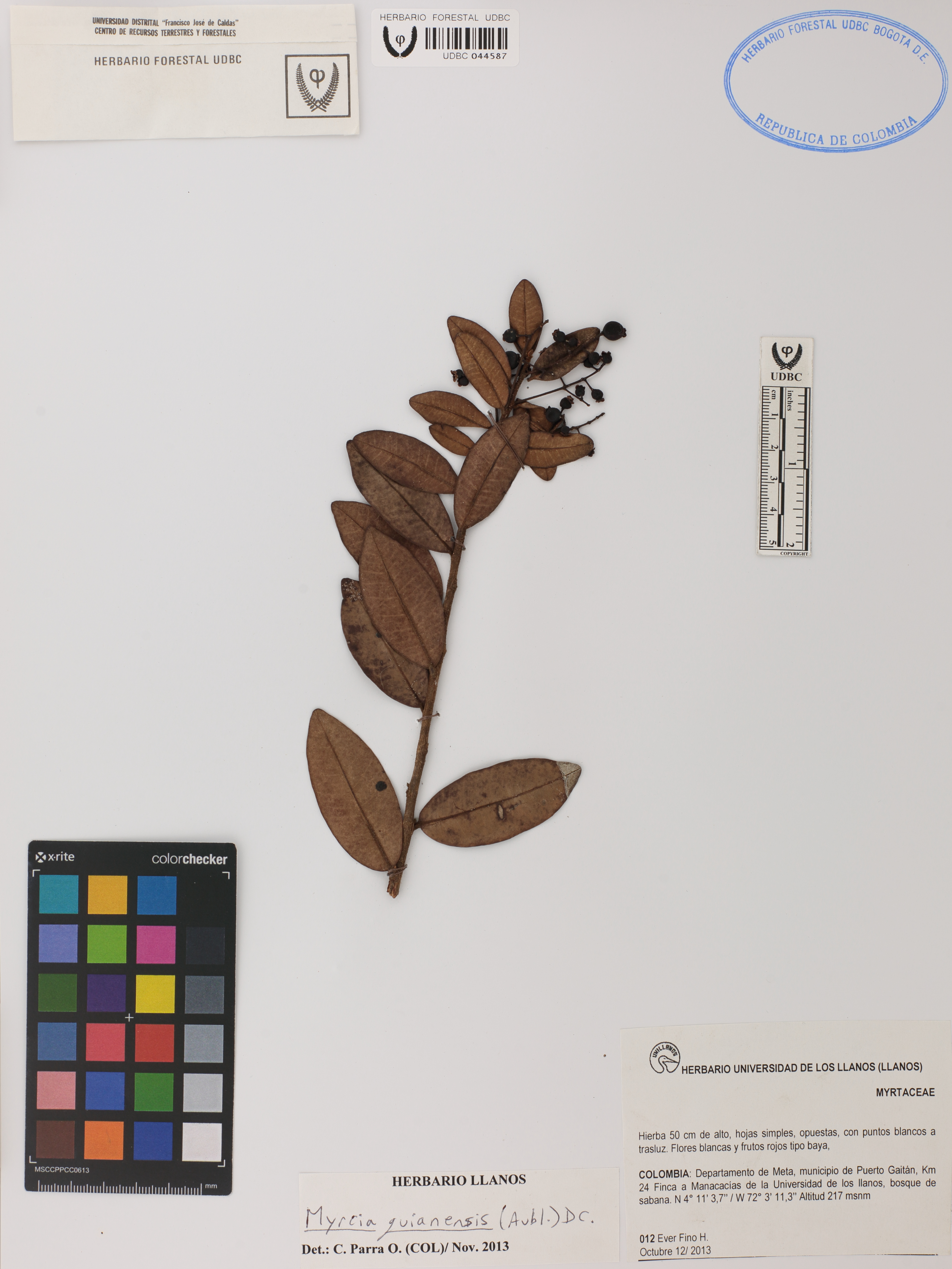 Fotografía del ejemplar Fino, E. 12, determinado como Myrcia guianensis en el año 2013