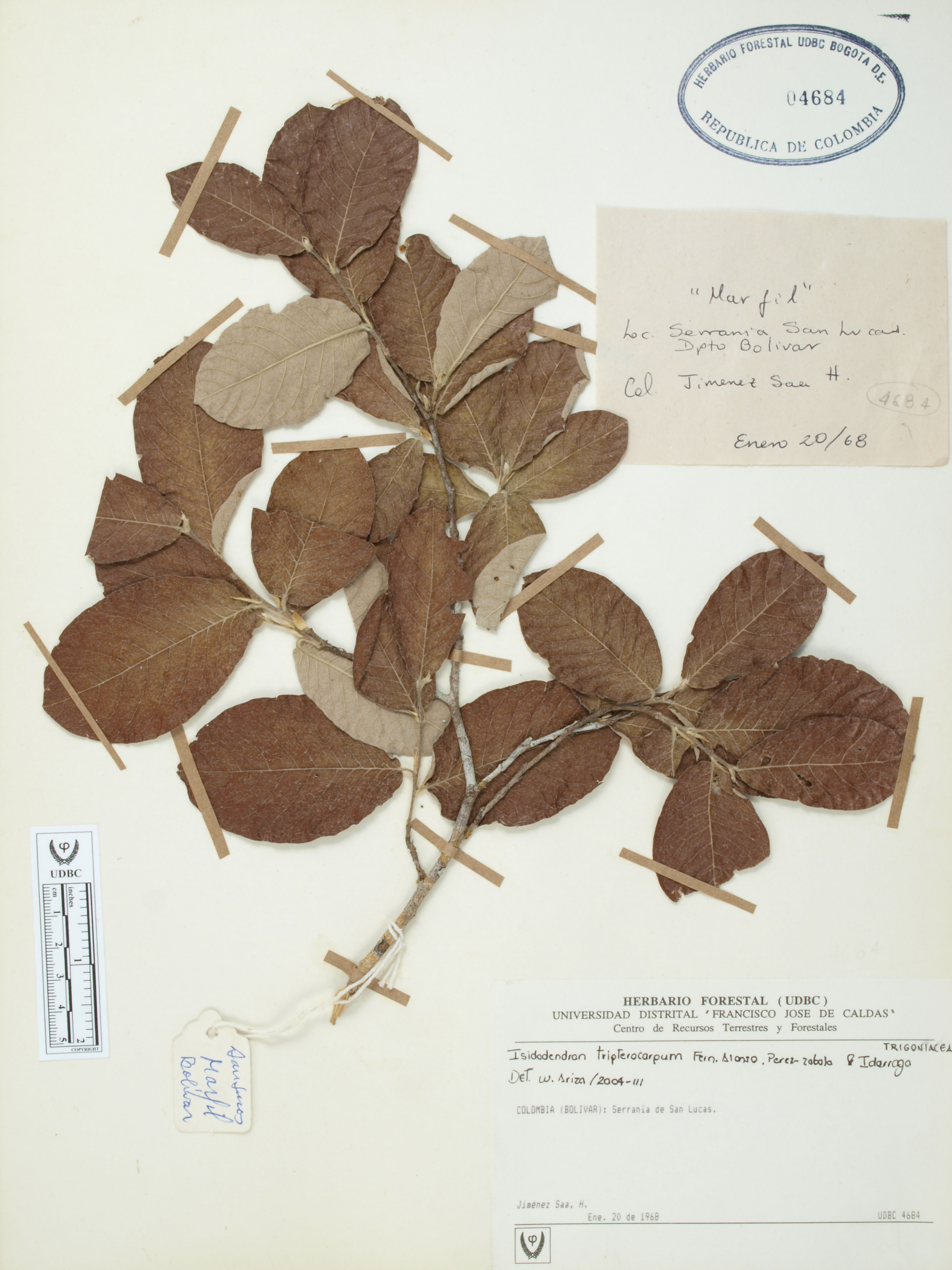 Fotografía del ejemplar Jiménez-Saa, H., determinado como Isidodendron tripterocarpum en el año 2004