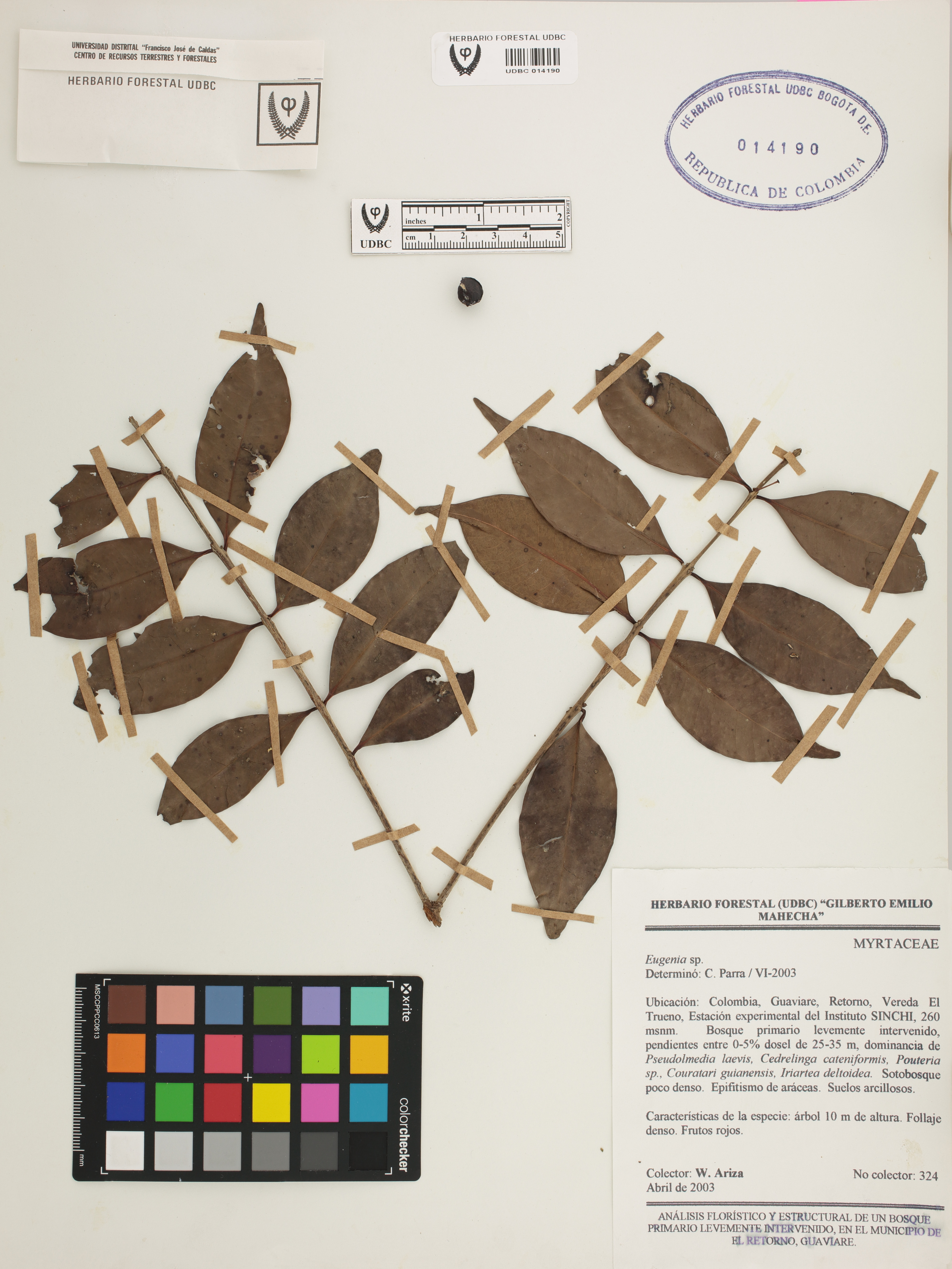 Fotografía del ejemplar Ariza, W. 324, determinado como Eugenia sp. en el año 2003