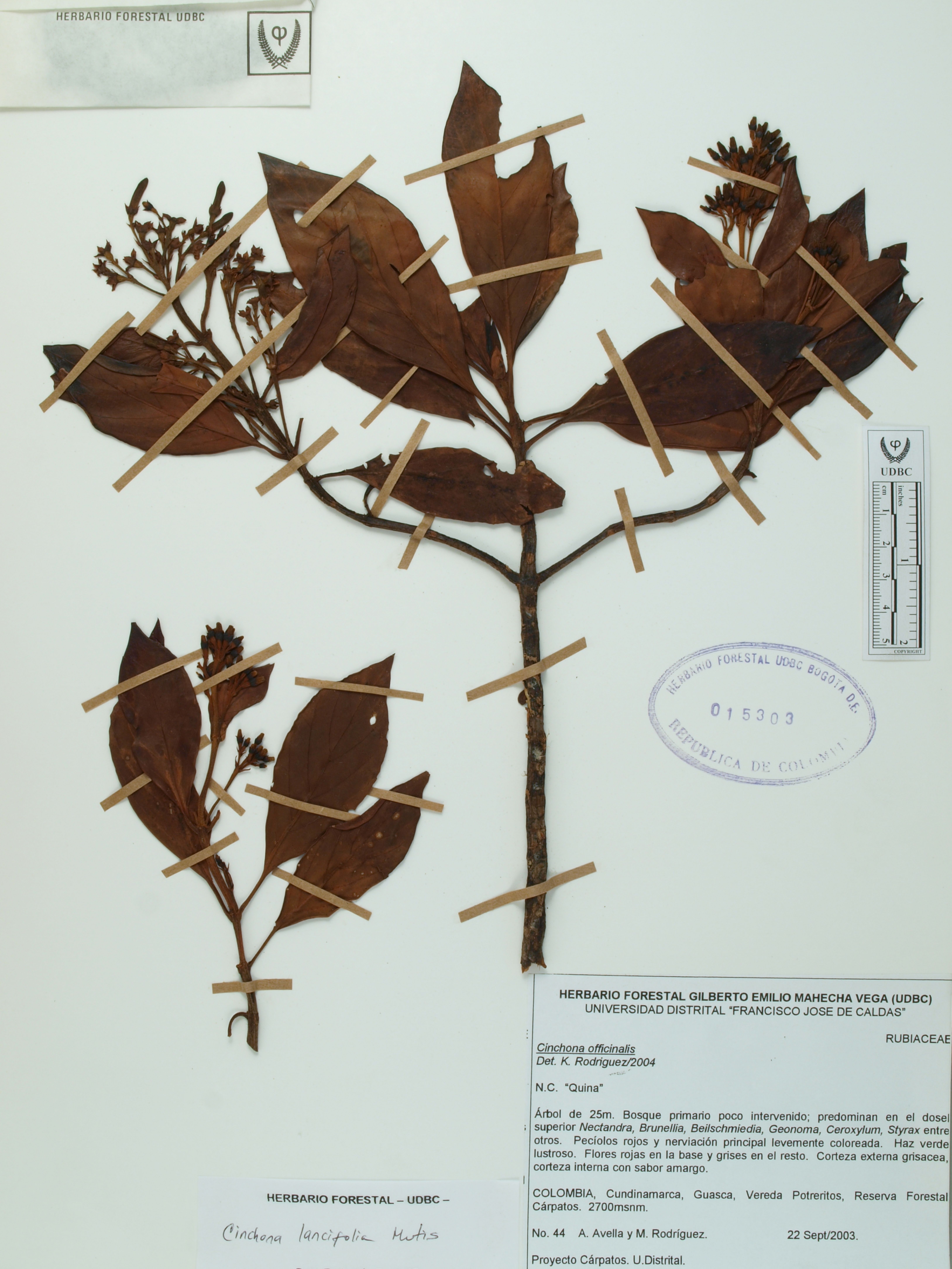 Fotografía del ejemplar Avella, A. 44, determinado como Cinchona lancifolia en el año 2007