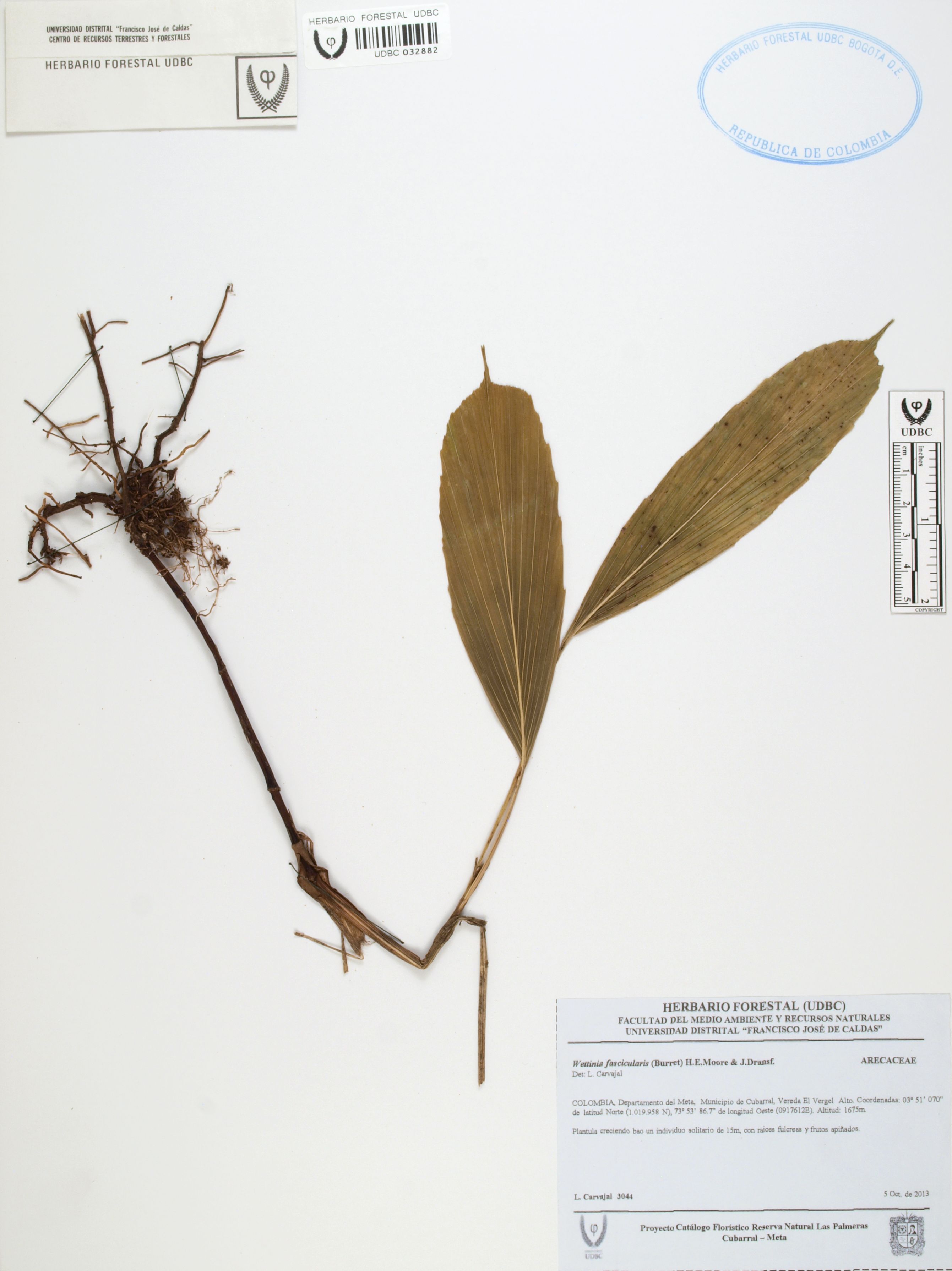 Fotografía del ejemplar Carvajal, L. 3044, determinado como Wettinia fascicularis