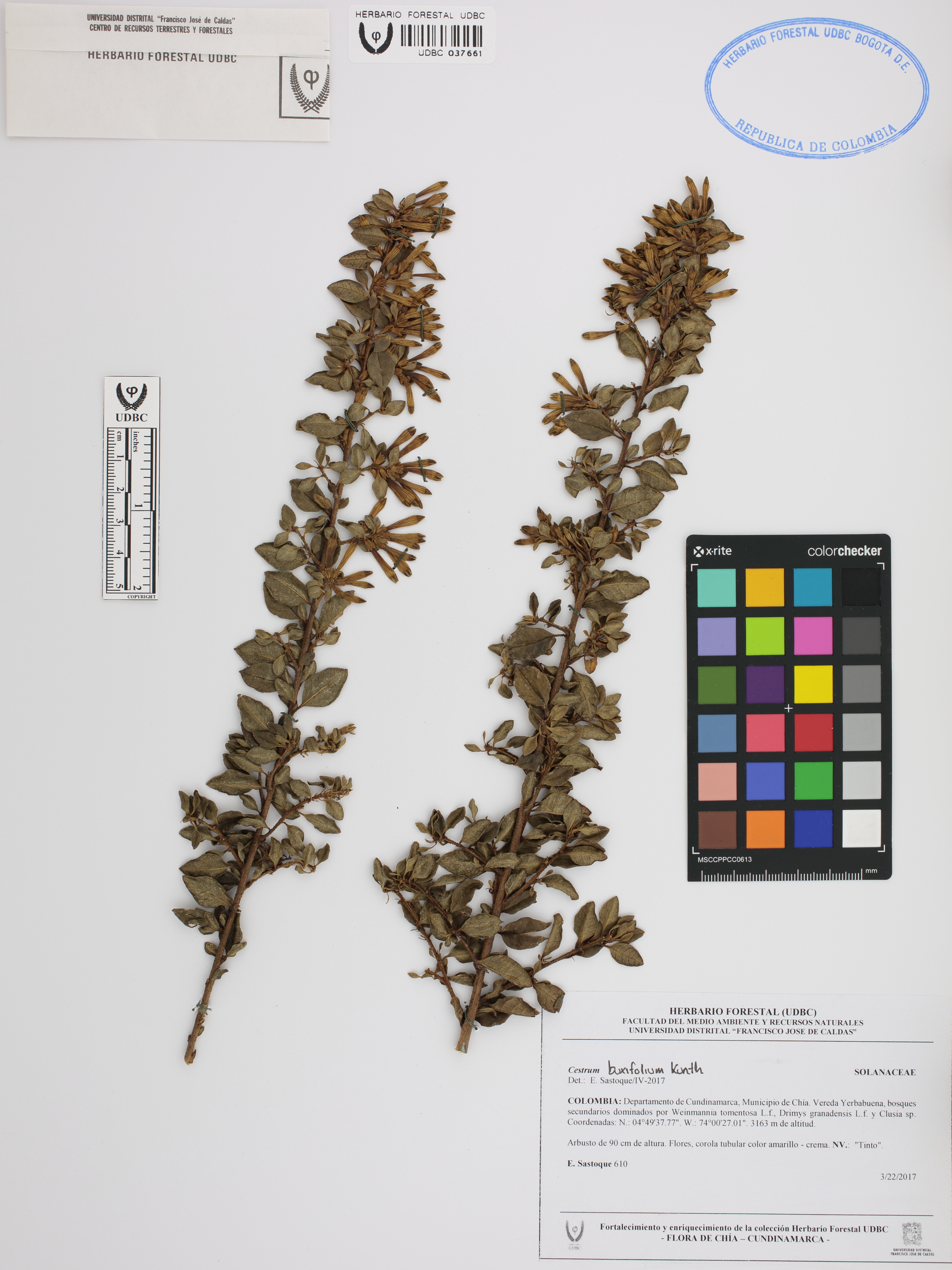 Fotografía del ejemplar Sastoque, E. 610, determinado como Cestrum buxifolium en el año 2017