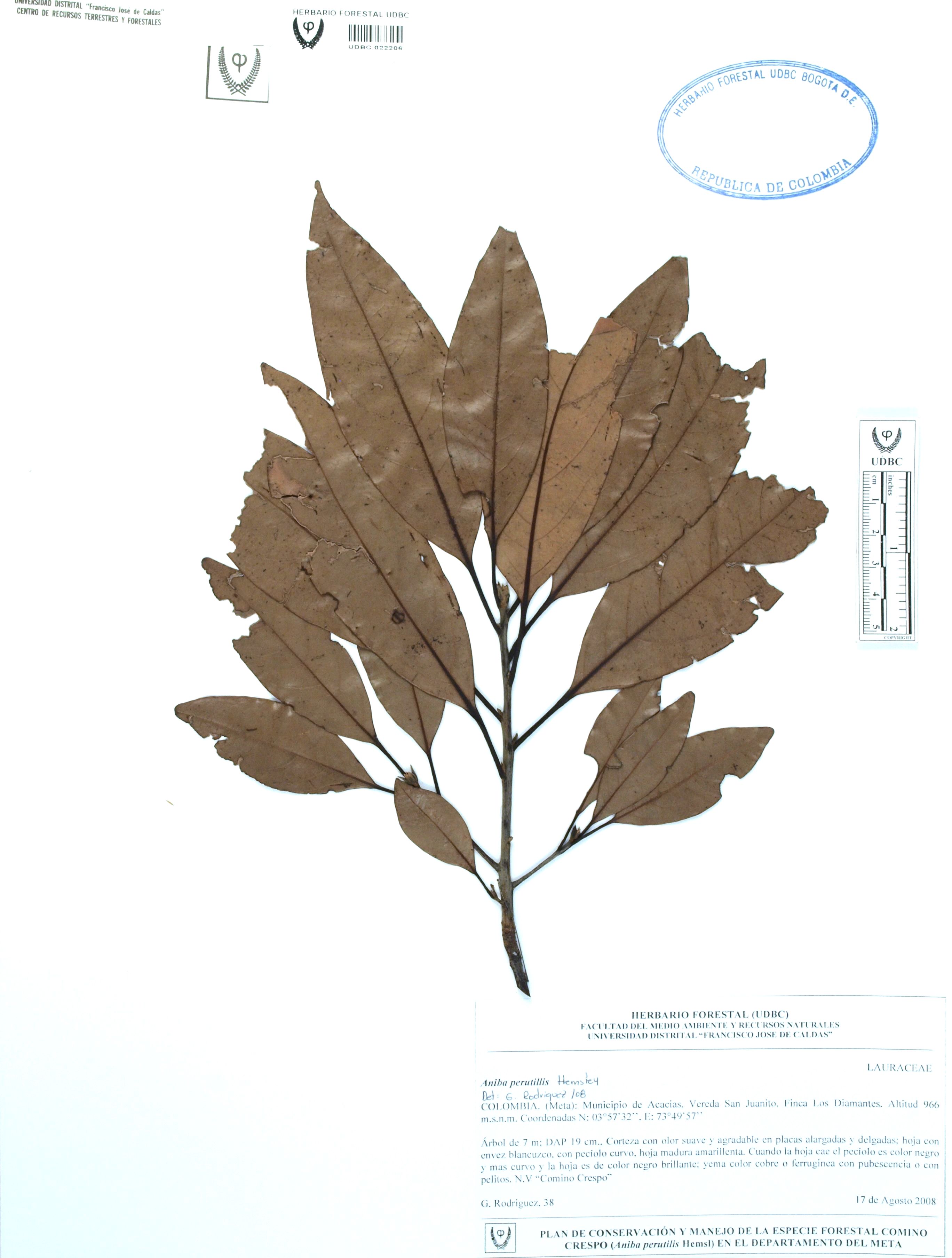 Fotografía del ejemplar Rodríguez, G. 38, determinado como Aniba perutilis en el año 2008
