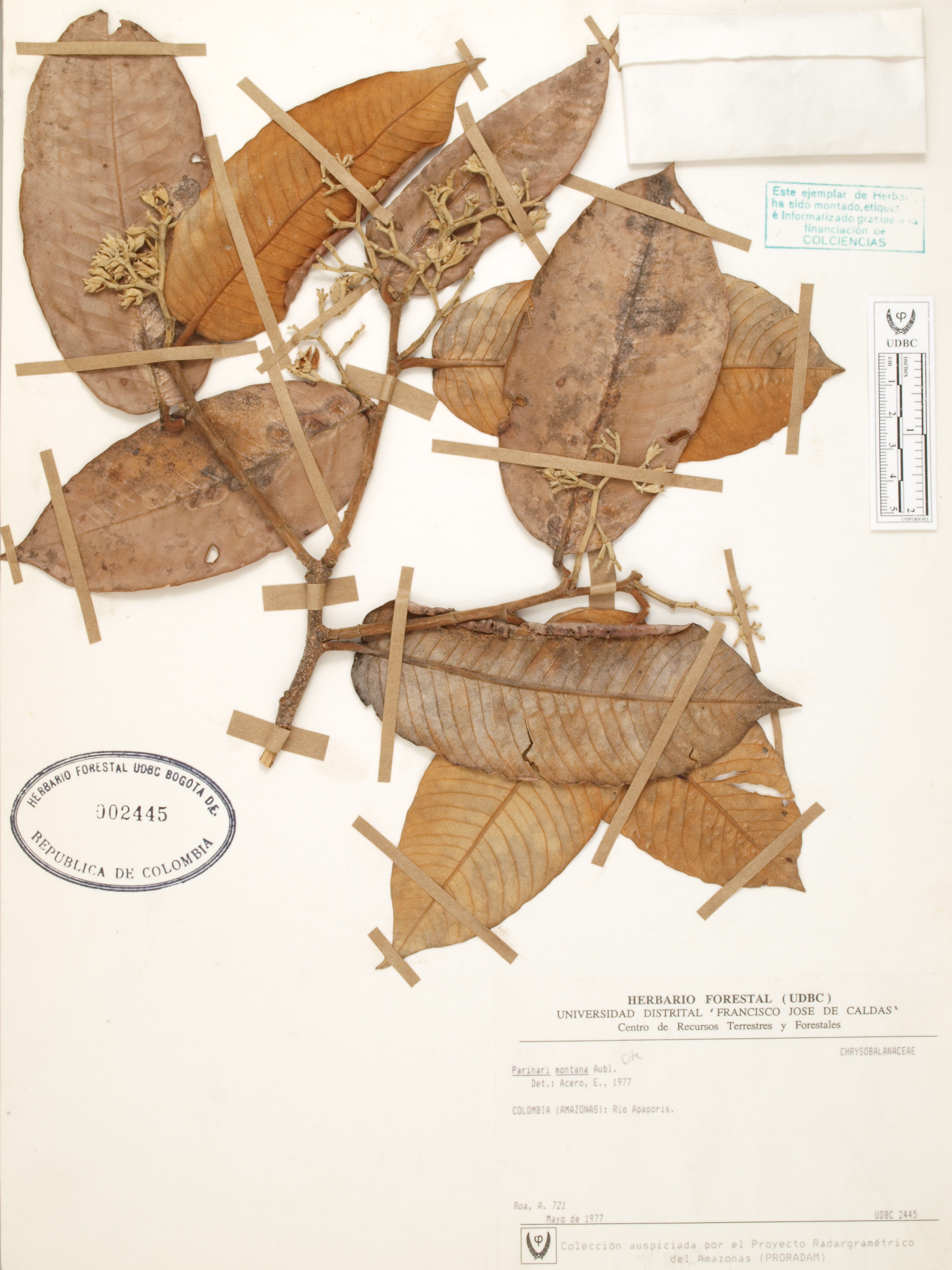 Fotografía del ejemplar Roa, A. 721, determinado como Parinari montana en el año 1977