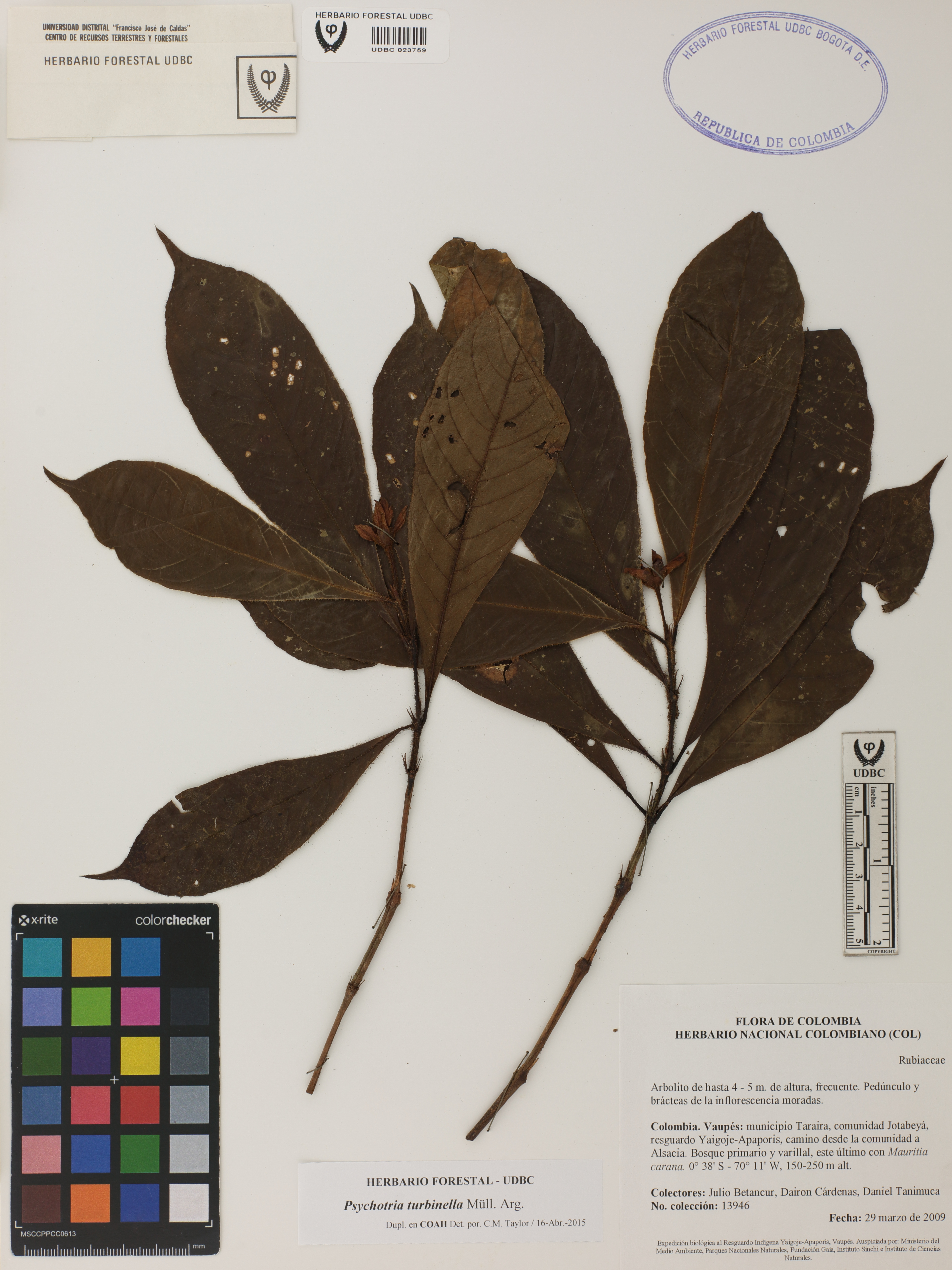 Fotografía del ejemplar Betancur, J. 13946, determinado como Psychotria turbinella en el año 2015