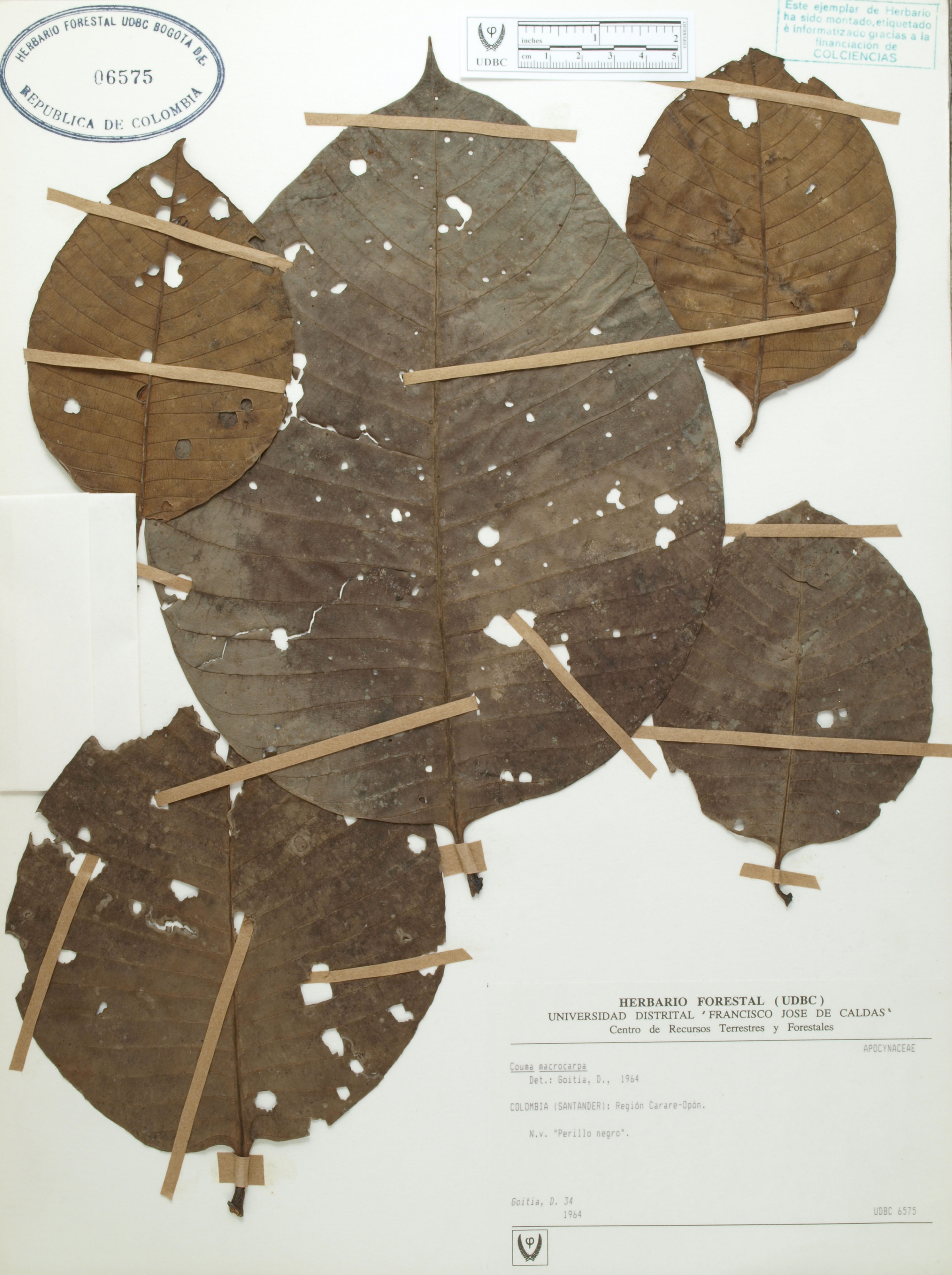 Fotografía del ejemplar Goitia, D. 34, determinado como Couma macrocarpa