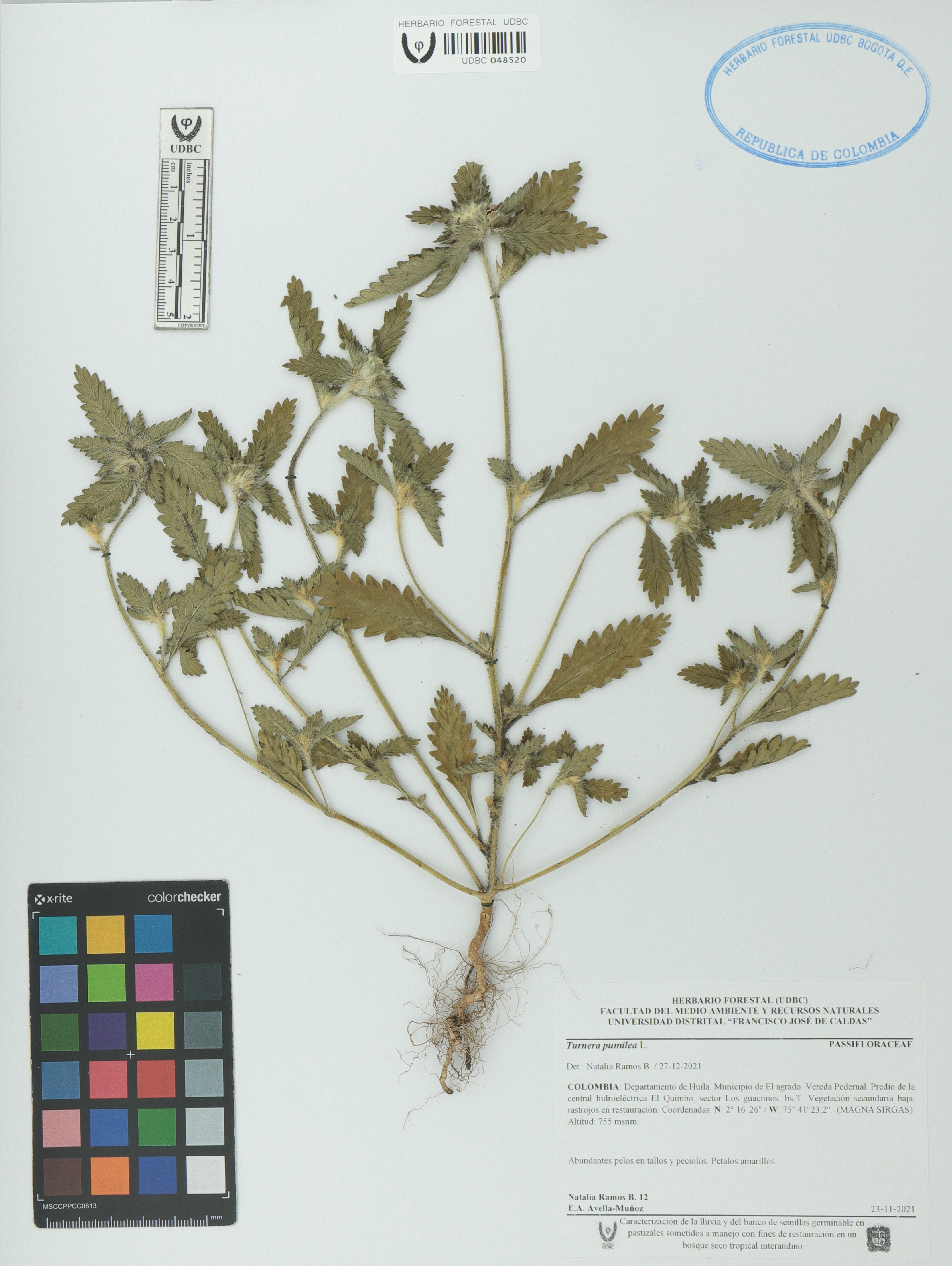 Fotografía del ejemplar Ramos-B., Natalia 12, determinado como Turnera pumilea en el año 2021