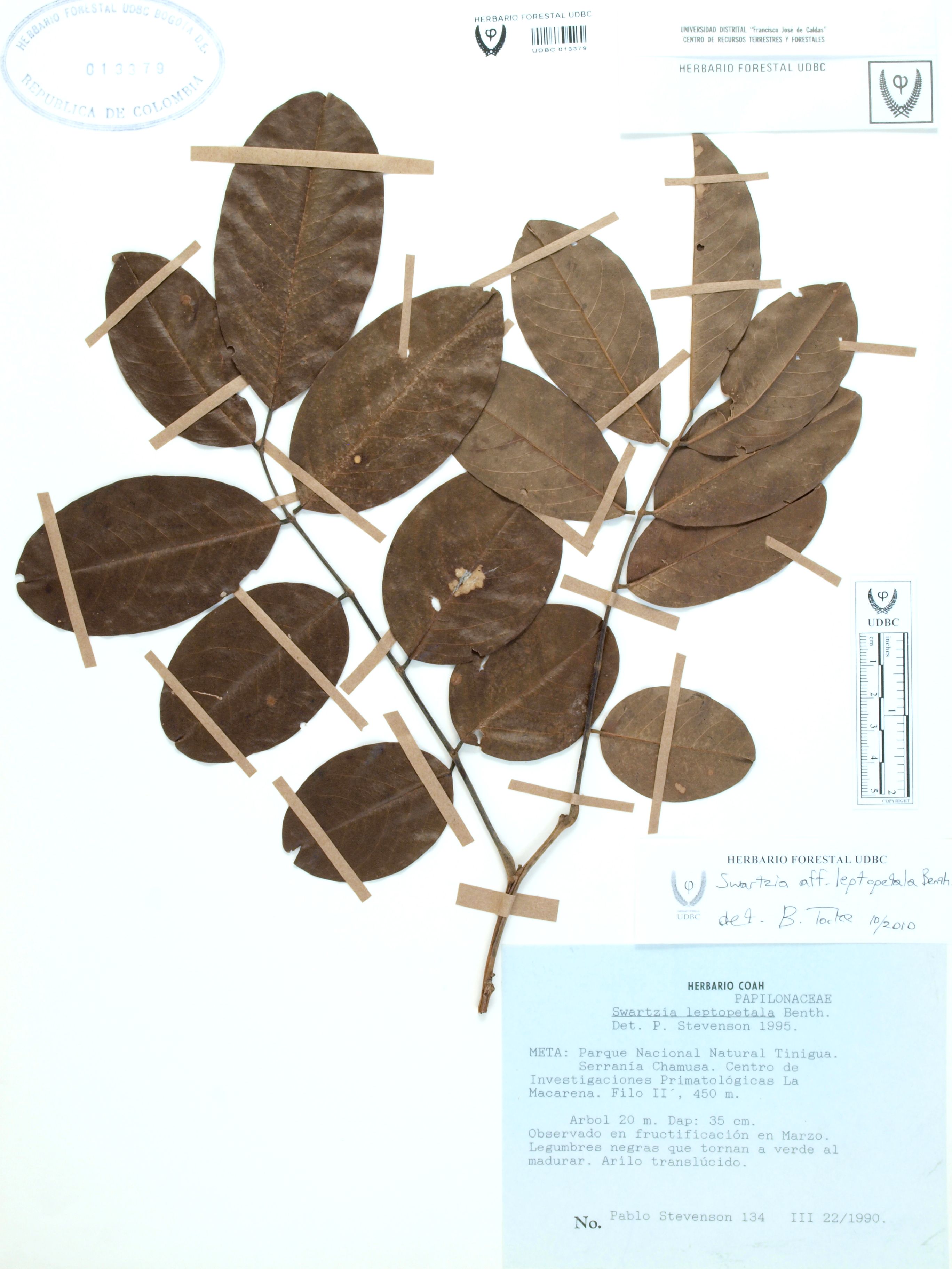 Fotografía del ejemplar Stevenson, P. 134, determinado como Swartzia leptopetala en el año 1995