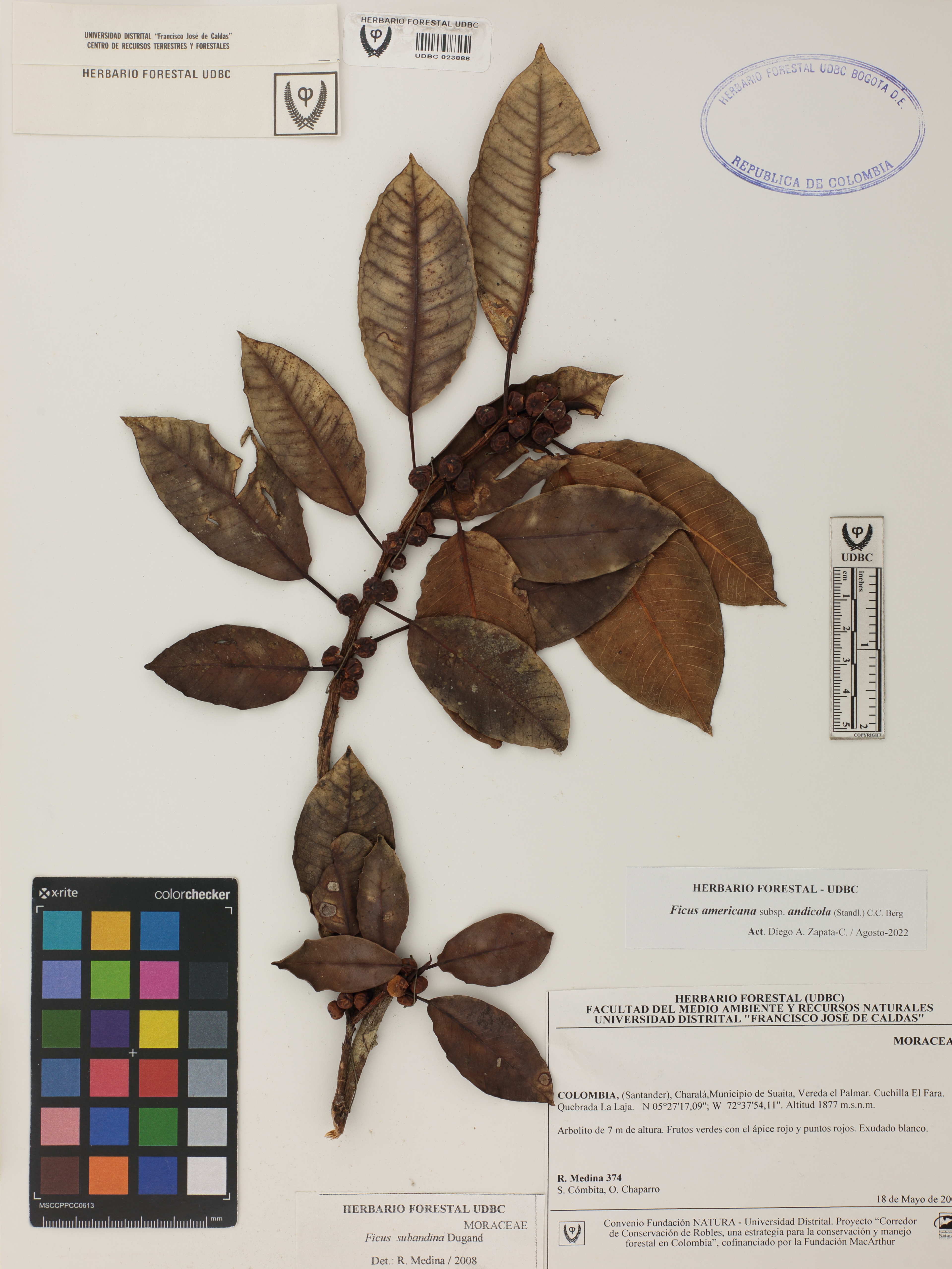 Fotografía del ejemplar Medina, R. 374, determinado como Ficus americana subsp. andicola en el año 2022