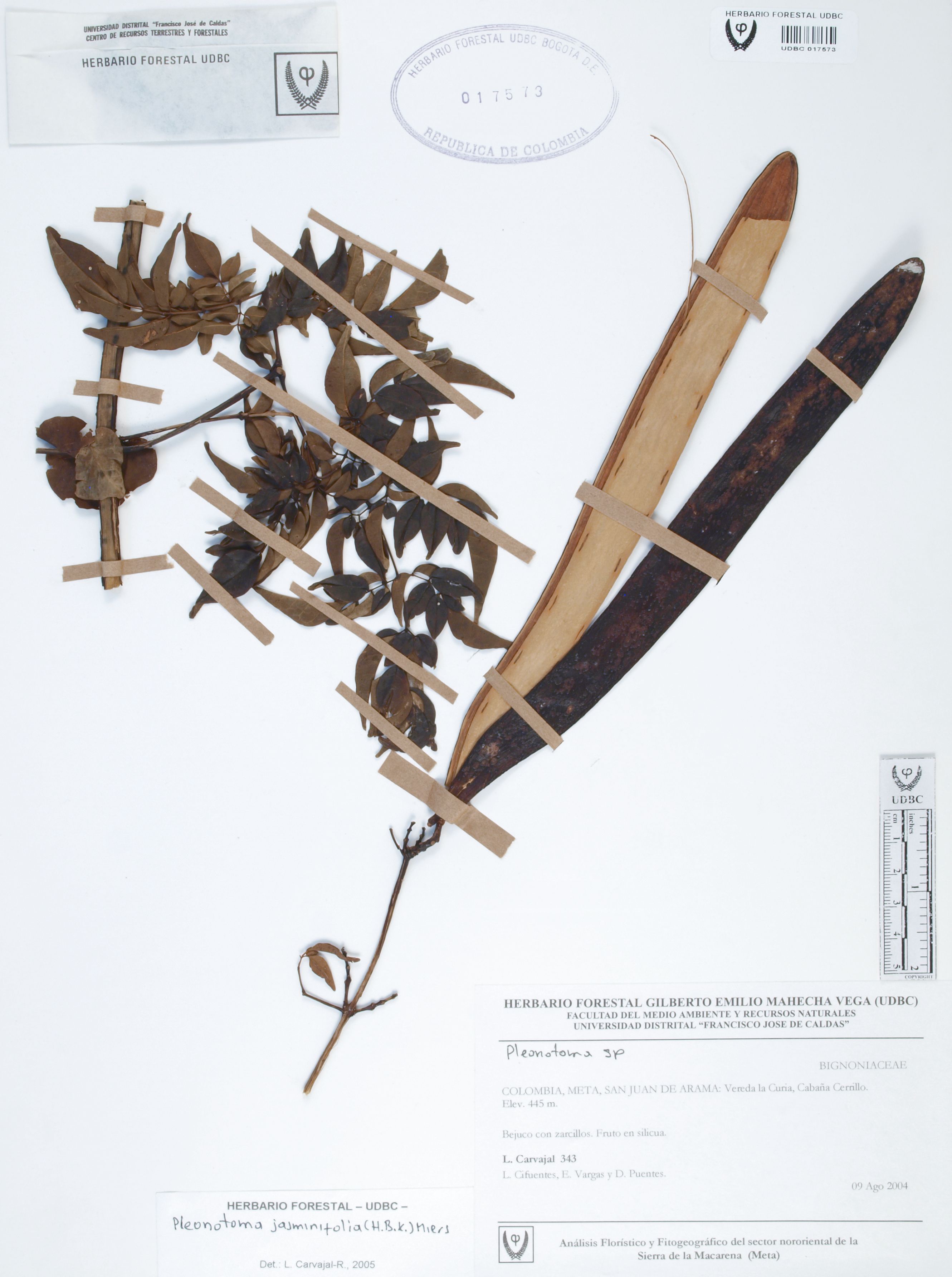 Fotografía del ejemplar Carvajal, L. 343, determinado como Pleonotoma jasminifolia en el año 2005
