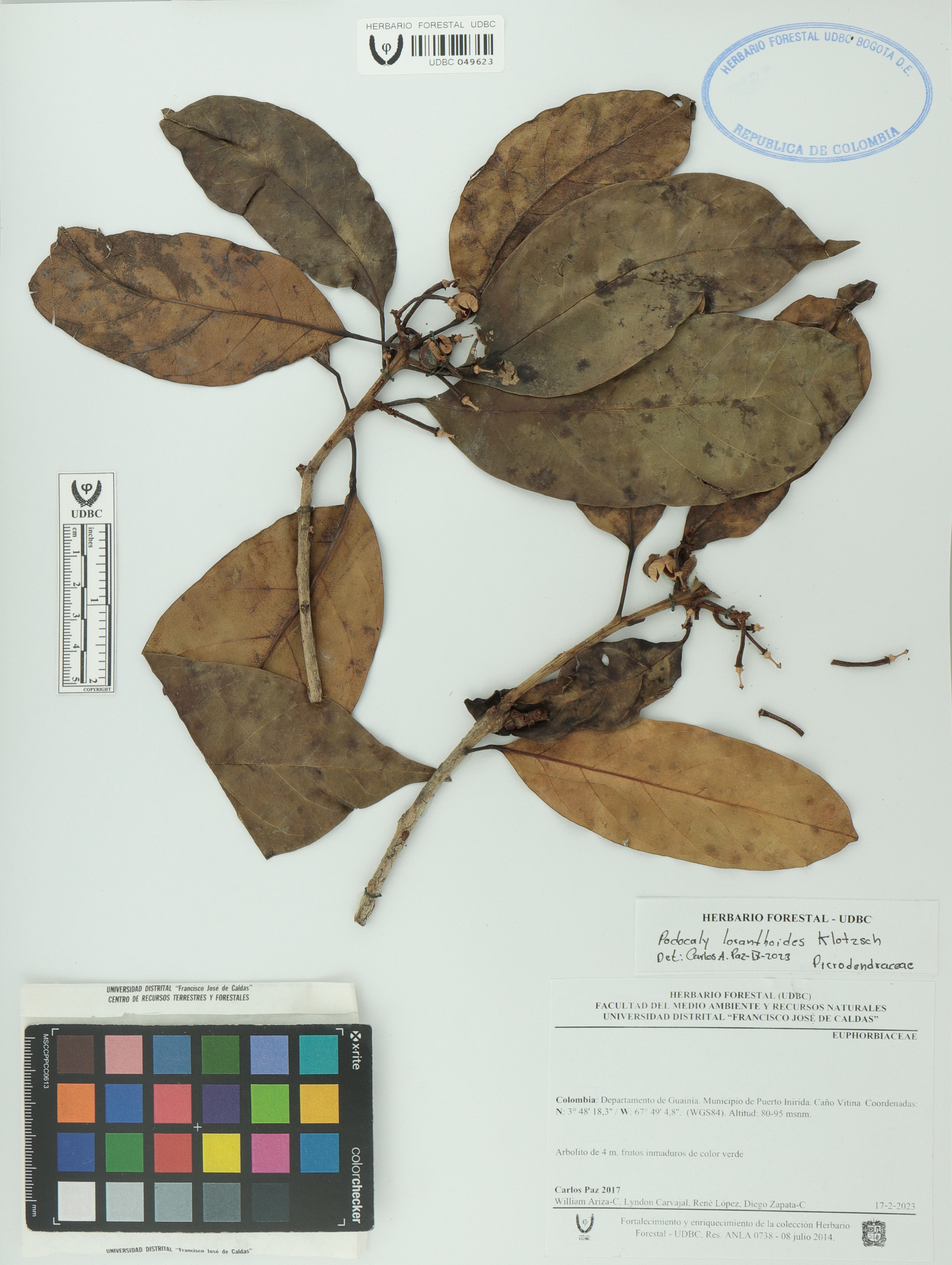 Fotografía del ejemplar Paz, C. 2017, determinado como Podocalyx loranthoides en el año 2023