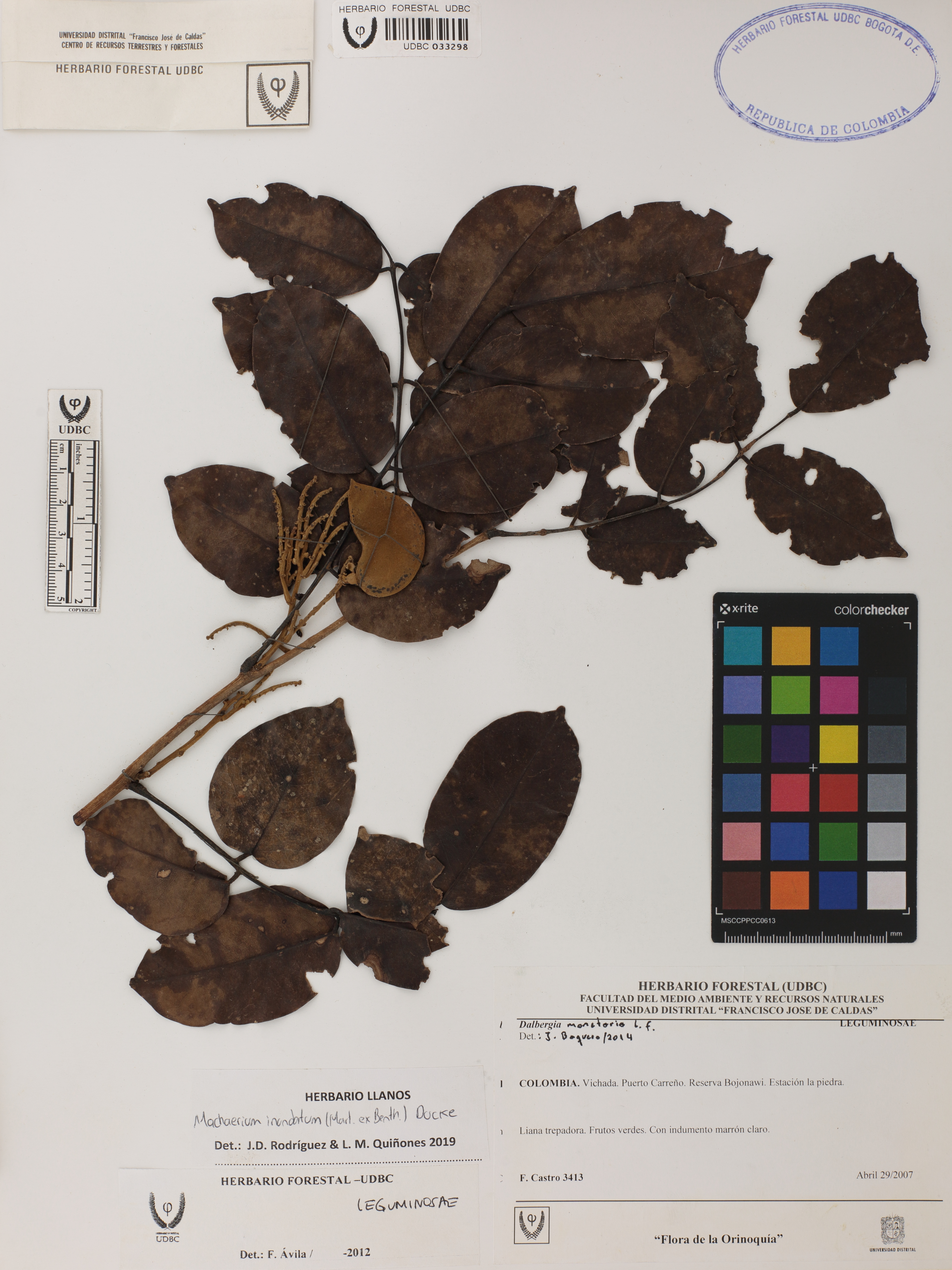 Fotografía del ejemplar Castro, F. 3413, determinado como Machaerium inundatum en el año 2019