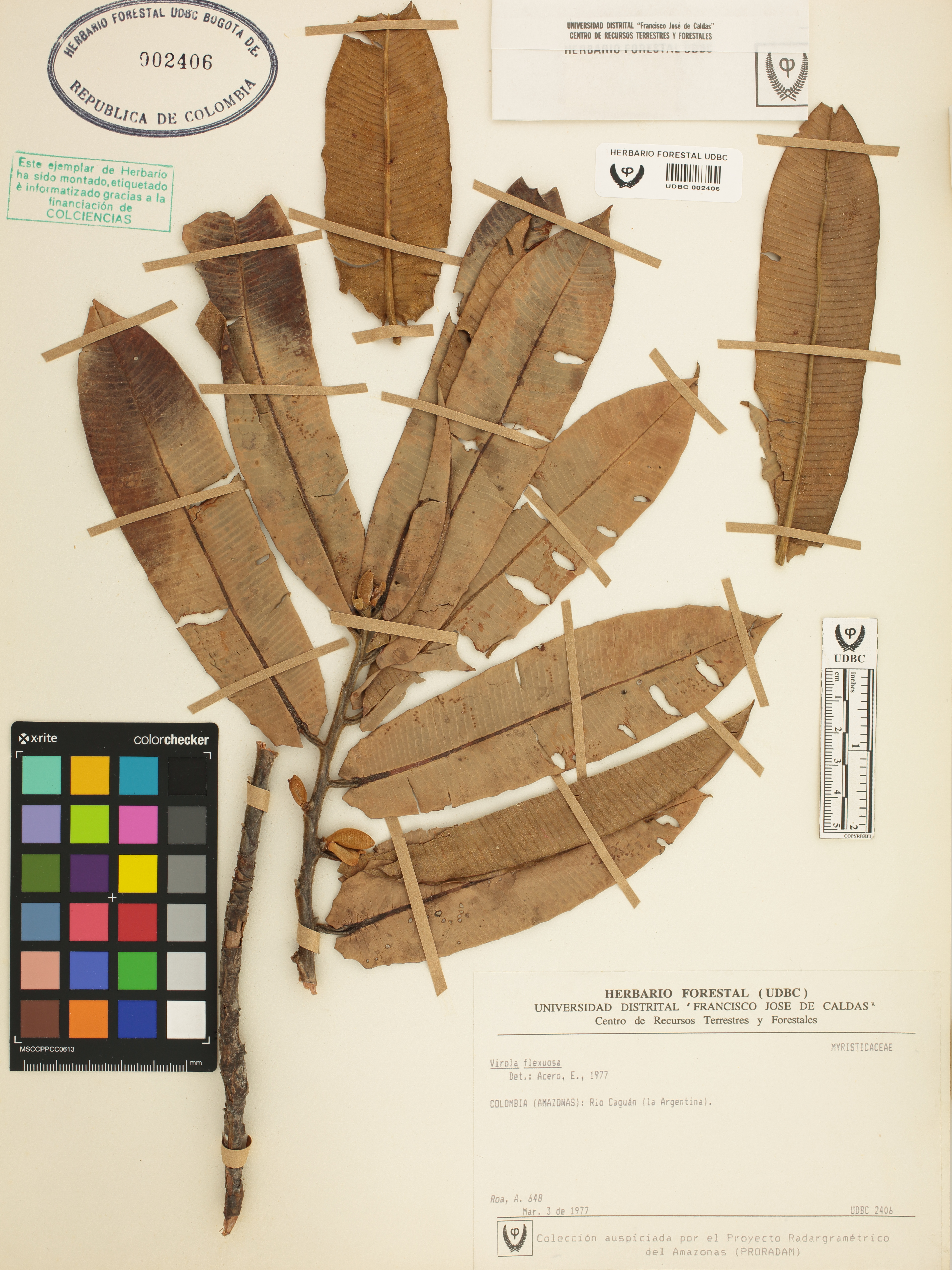 Fotografía del ejemplar Roa, A. 648, determinado como Virola flexuosa en el año 1977