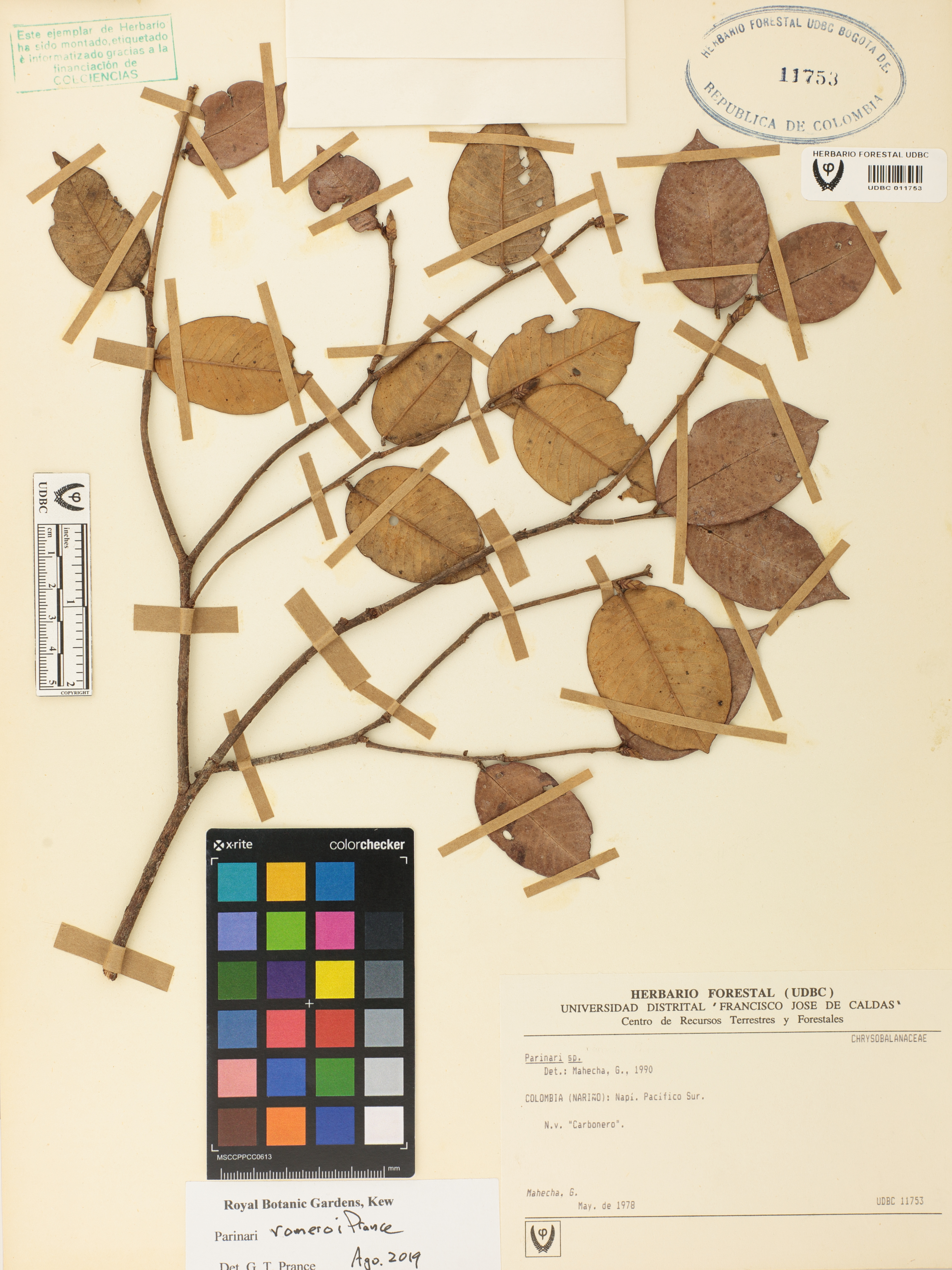 Fotografía del ejemplar Mahecha, G., determinado como Parinari romeroi en el año 2019