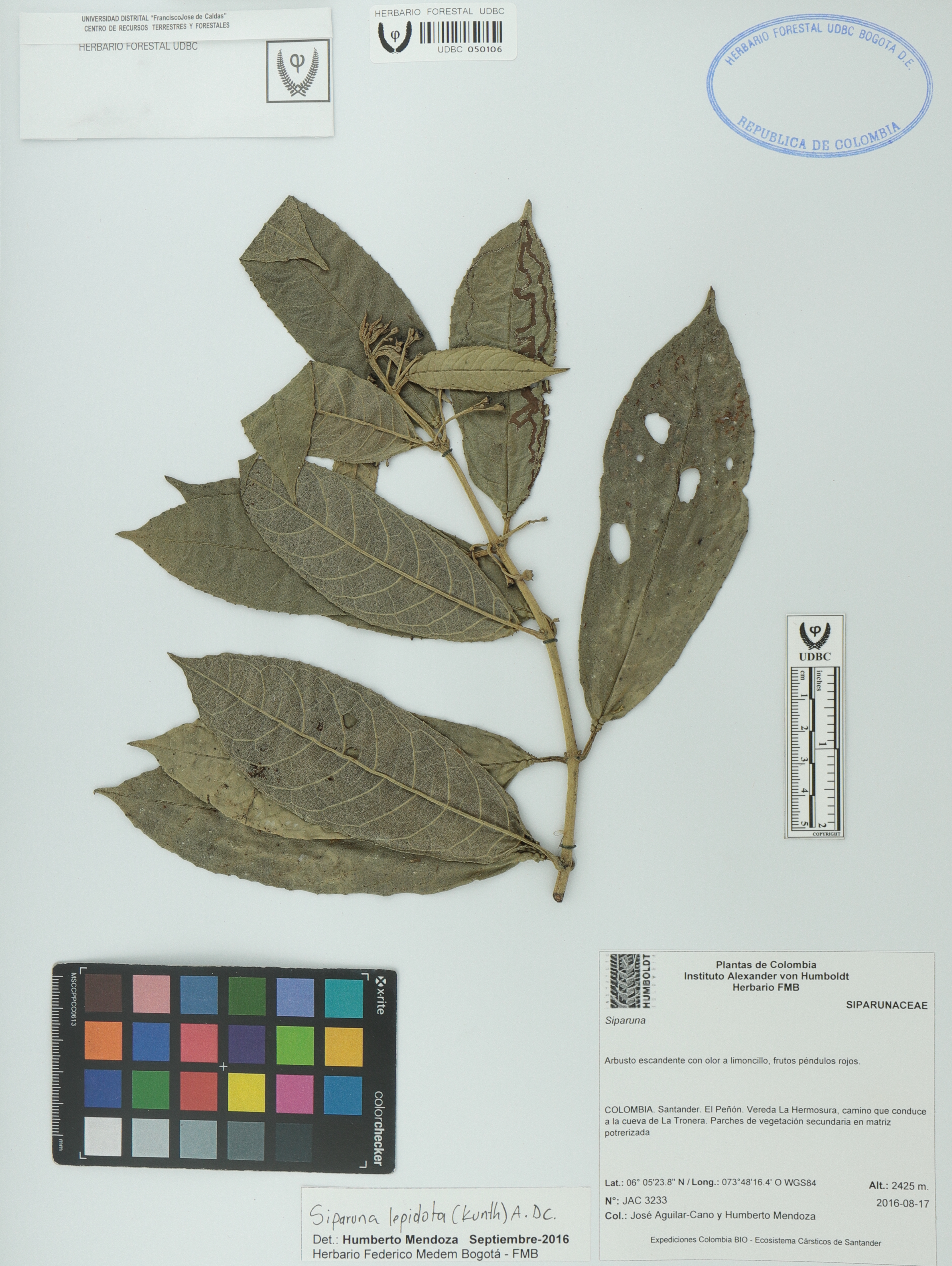 Fotografía del ejemplar Aguilar-Cano, J. 3233, determinado como Siparuna lepidota