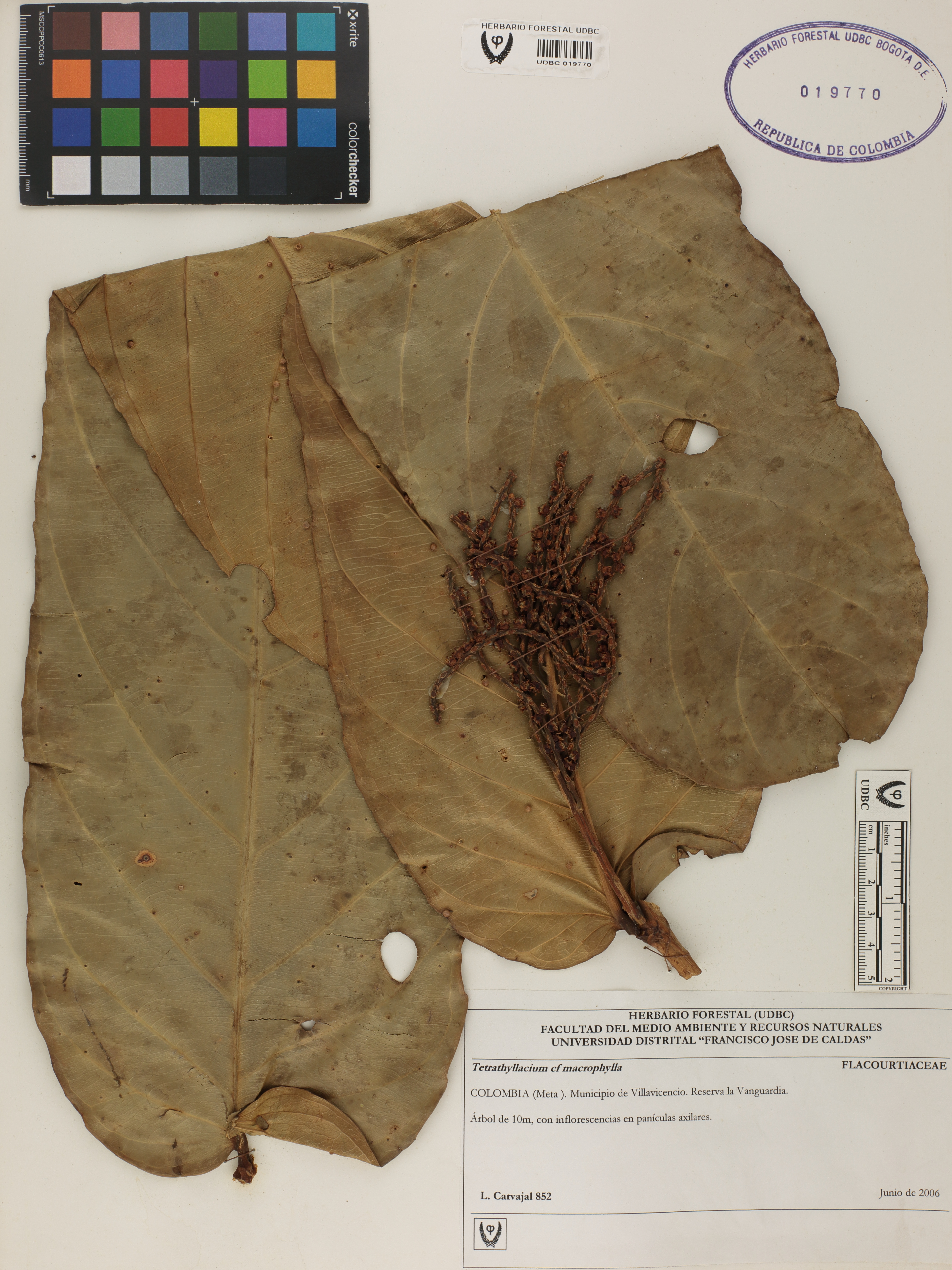 Fotografía del ejemplar Carvajal, L. 852, determinado como Tetrathylacium macrophyllum