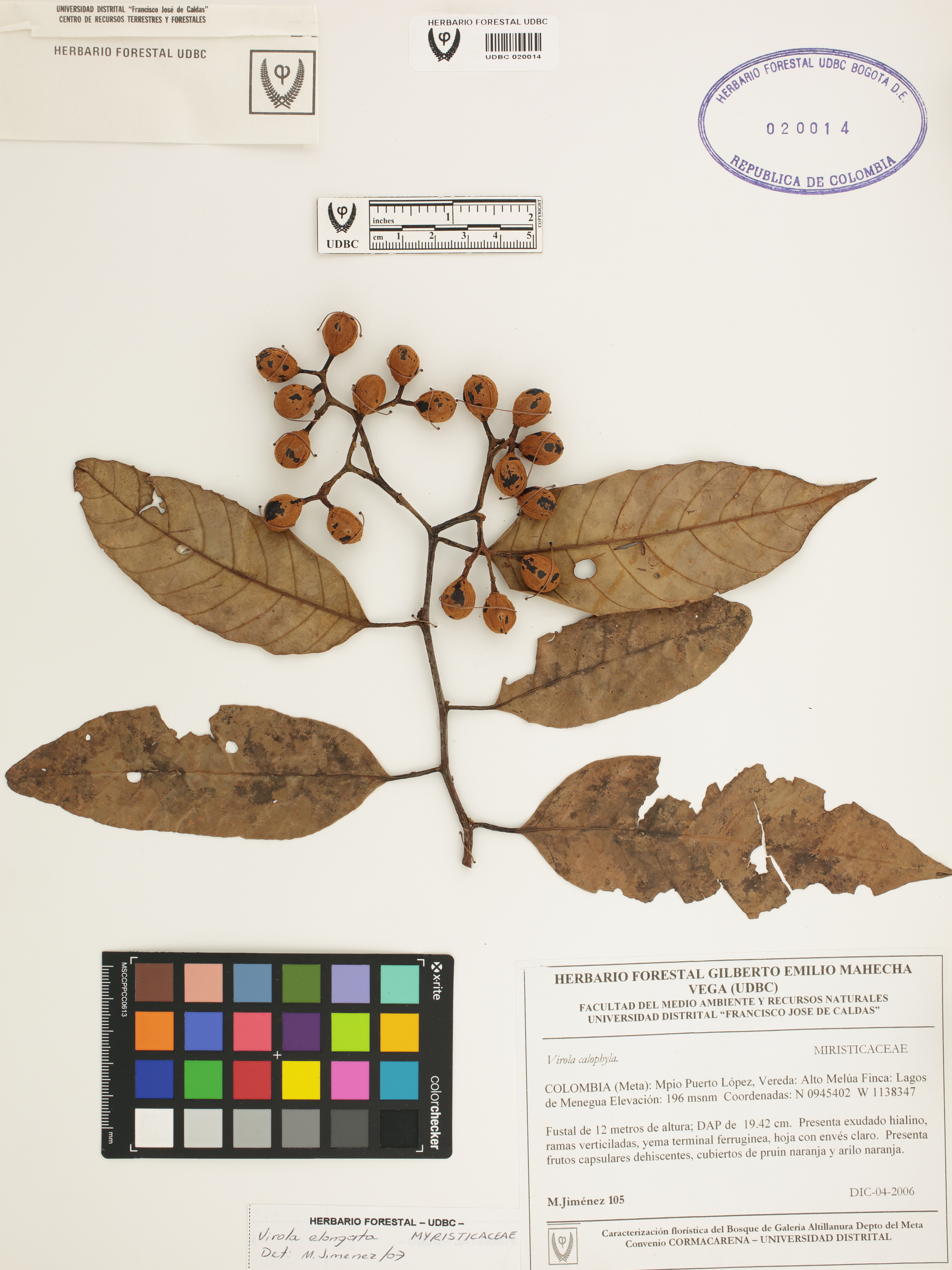 Fotografía del ejemplar Jiménez, M. 105, determinado como Virola elongata en el año 2007