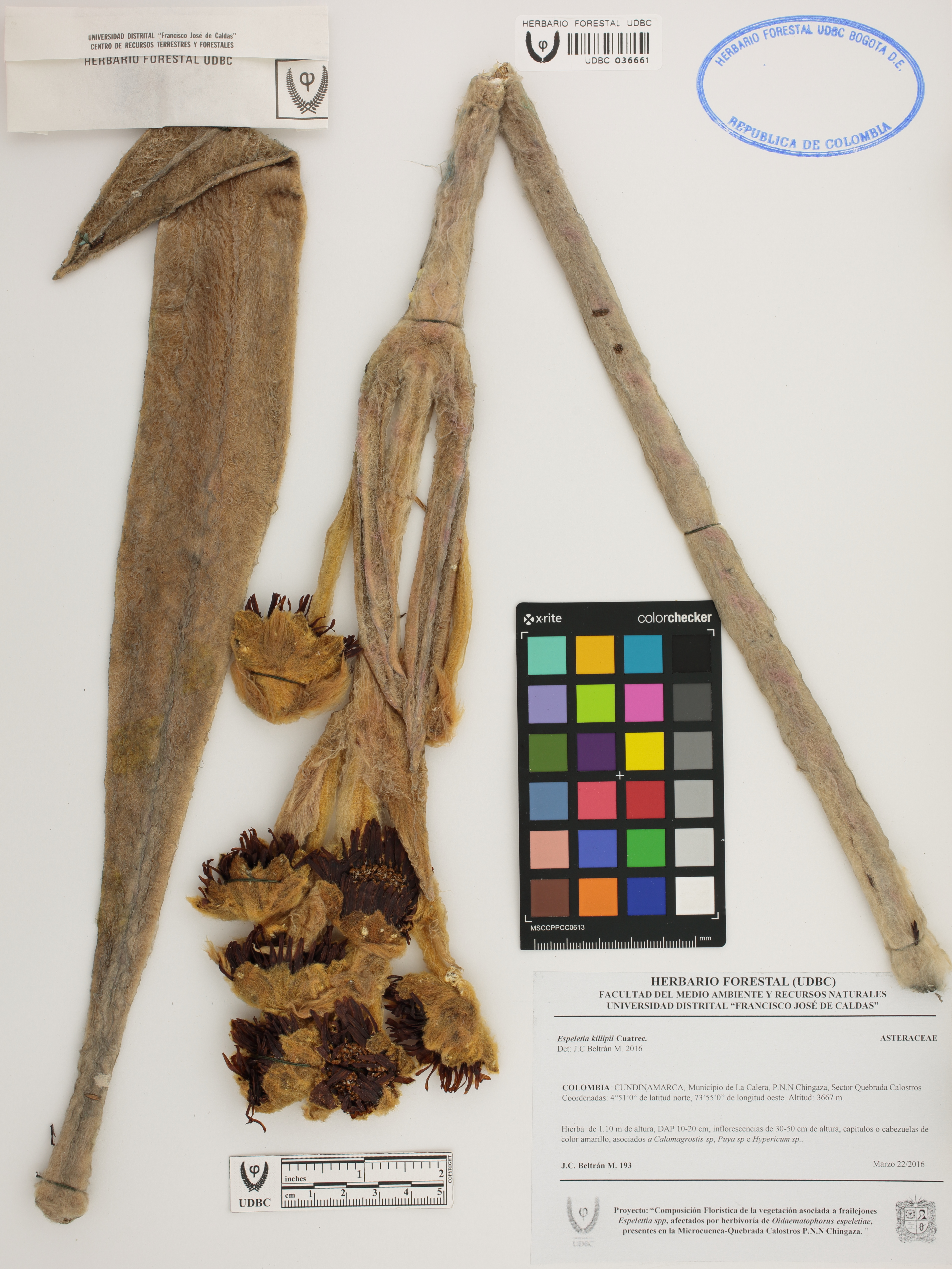 Fotografía del ejemplar Beltrán, J. 193, determinado como Espeletia killipii en el año 2016
