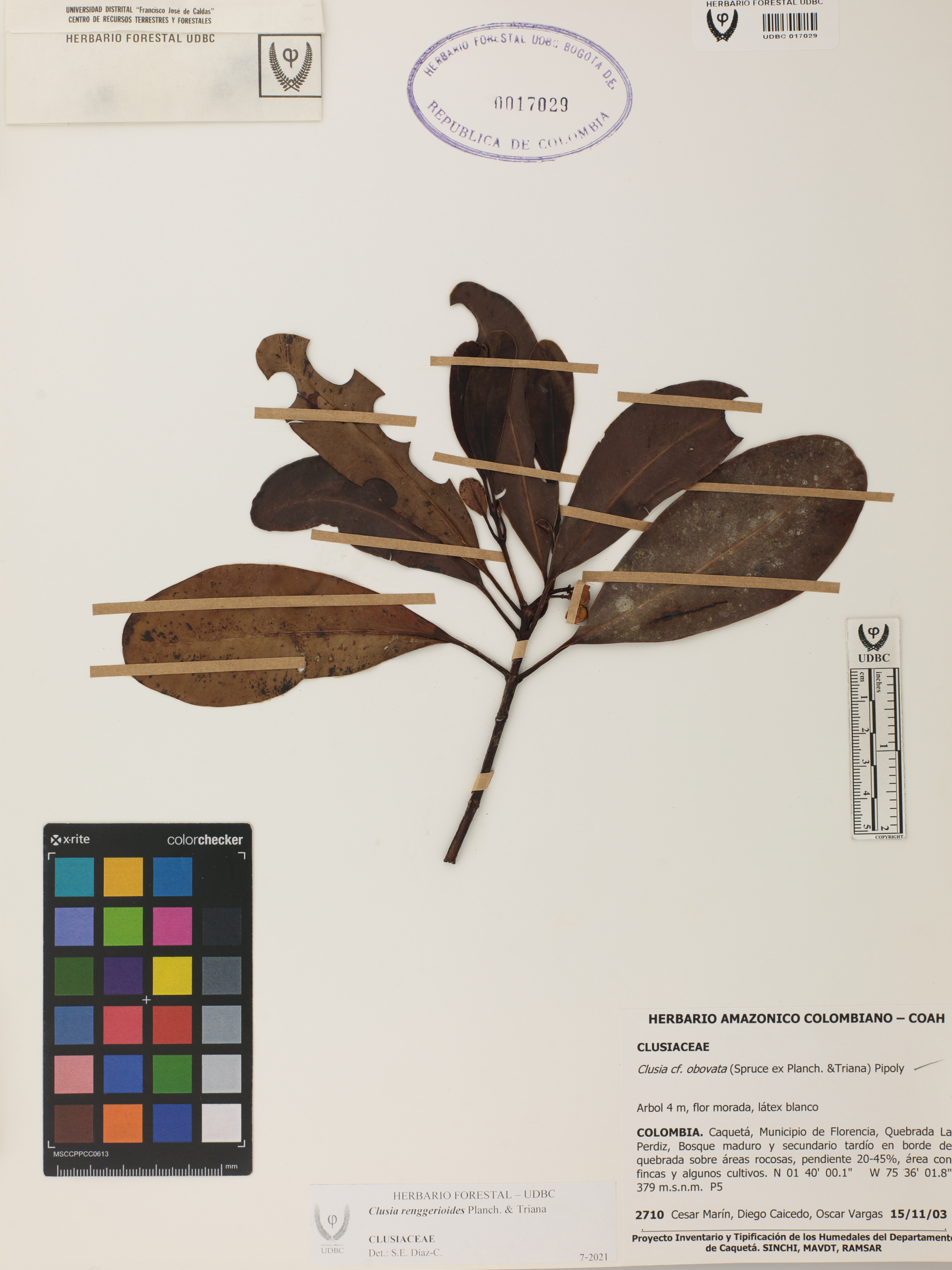Fotografía del ejemplar Marín, C. 2710, determinado como Clusia renggerioides en el año 2021