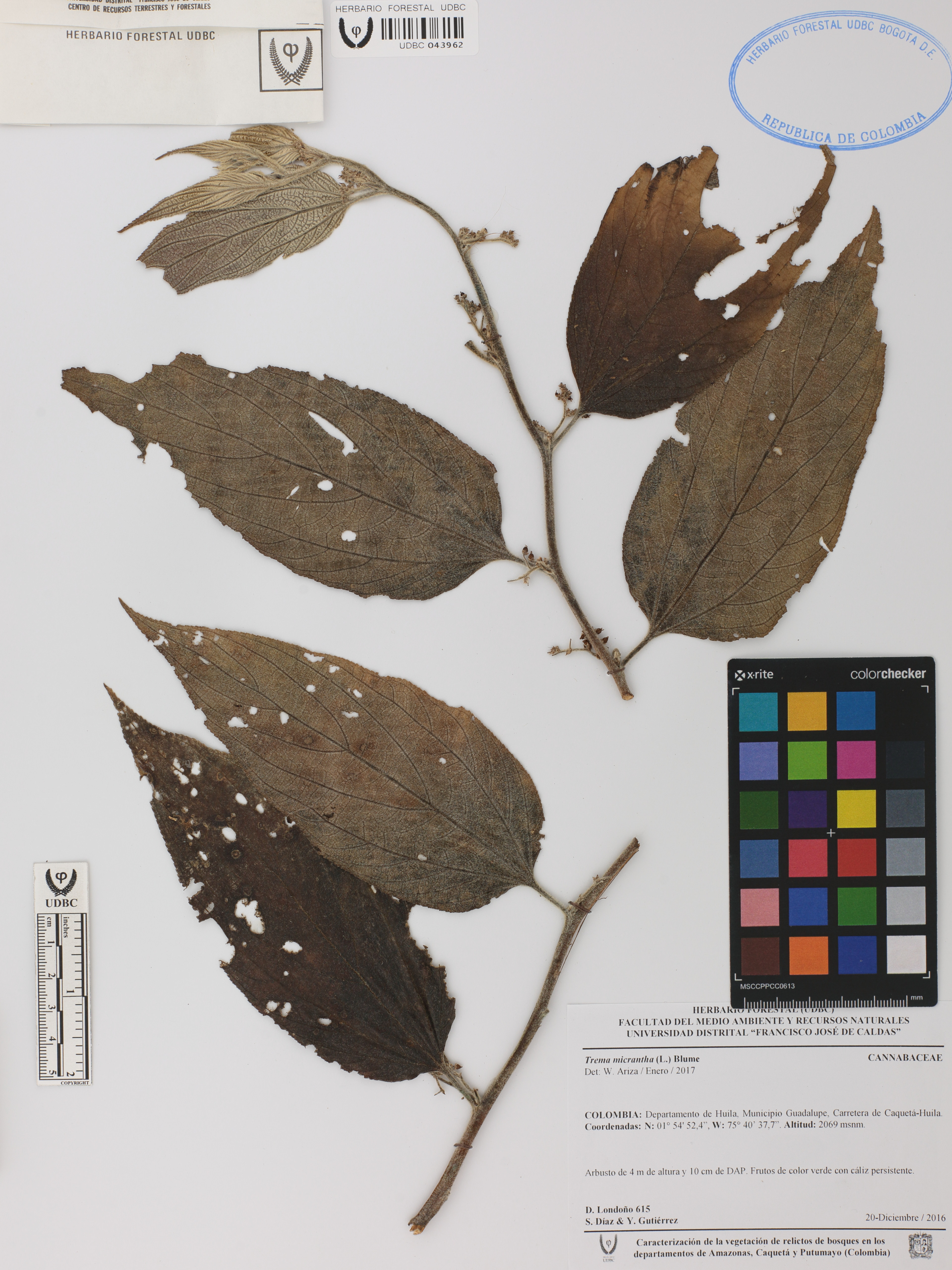 Fotografía del ejemplar Londoño, D. 615, determinado como Trema micranthum en el año 2017