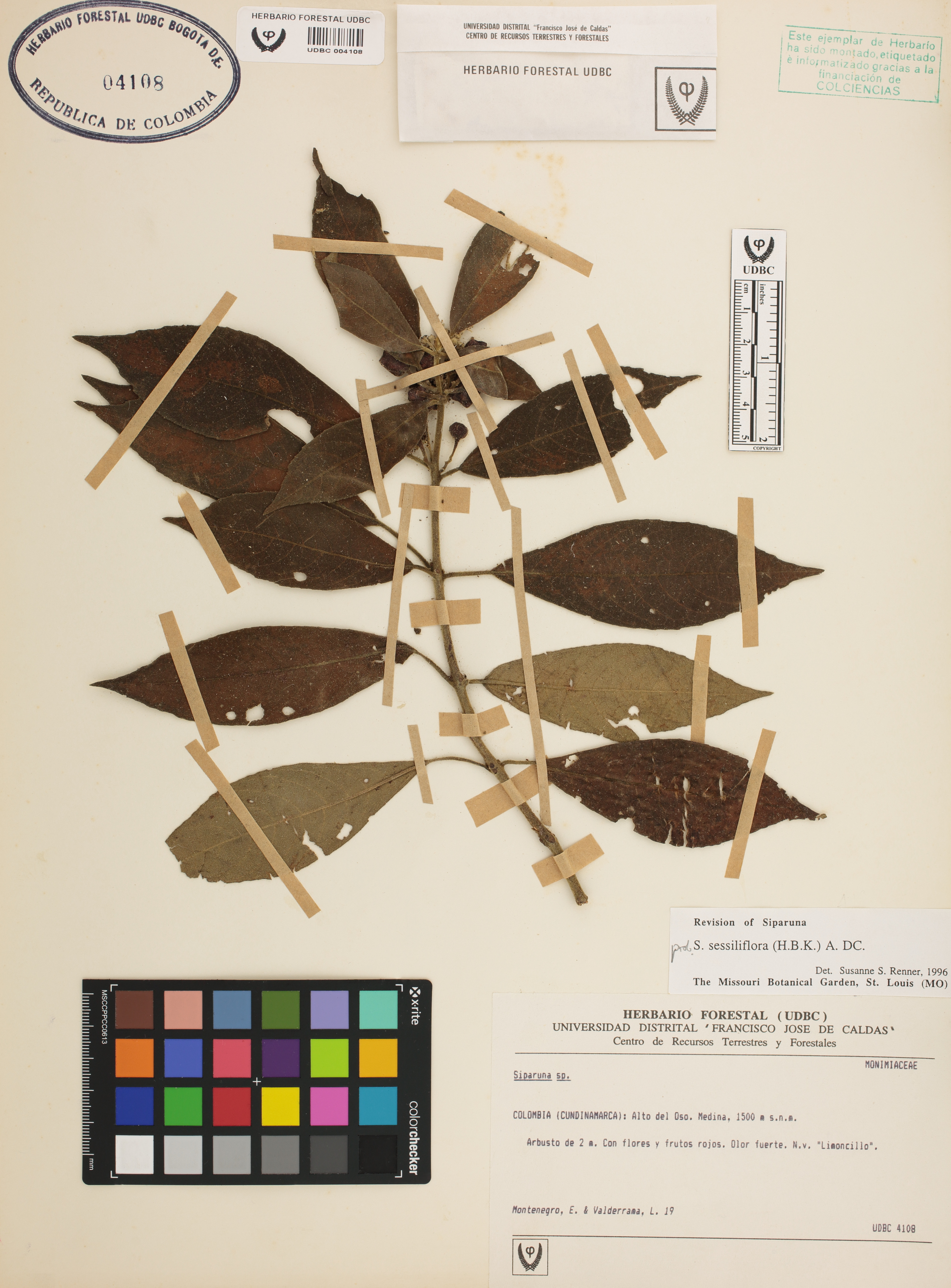 Fotografía del ejemplar Montenegro, E. 19, determinado como Siparuna sessiliflora en el año 1996