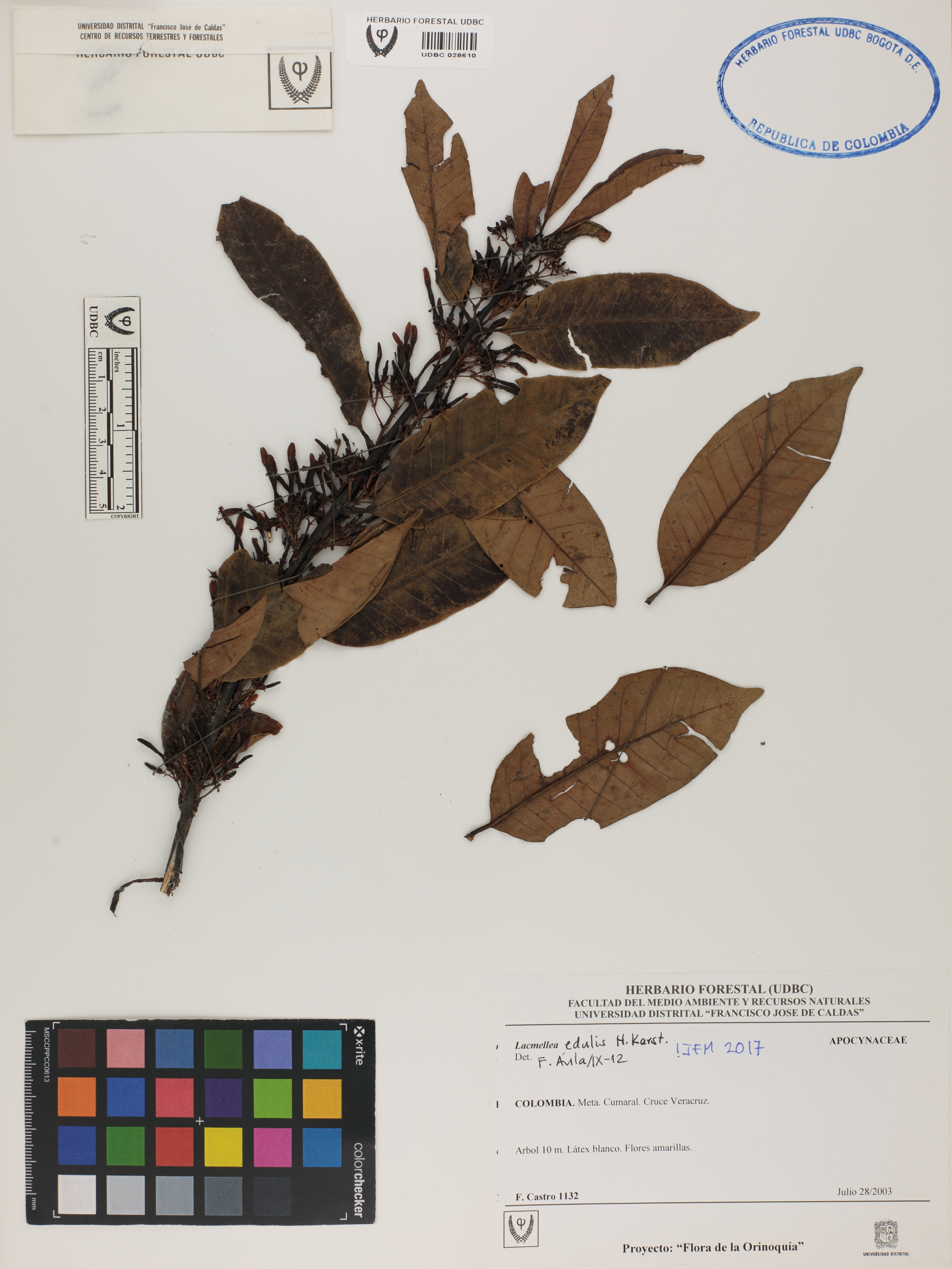Fotografía del ejemplar Castro, F. 1132, determinado como Lacmellea edulis en el año 2012