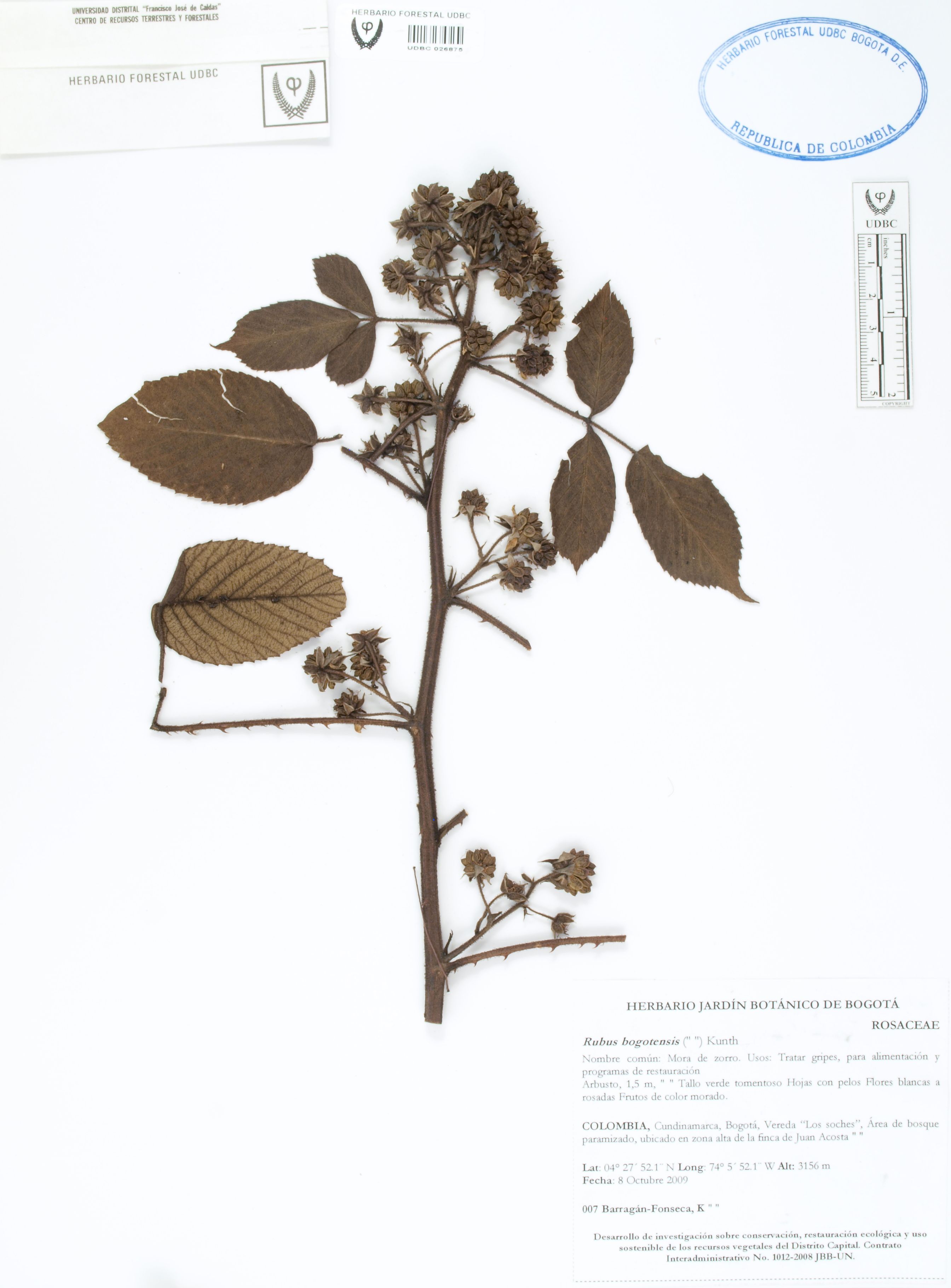 Fotografía del ejemplar Barragán-Fonseca, K. 7, determinado como Rubus bogotensis