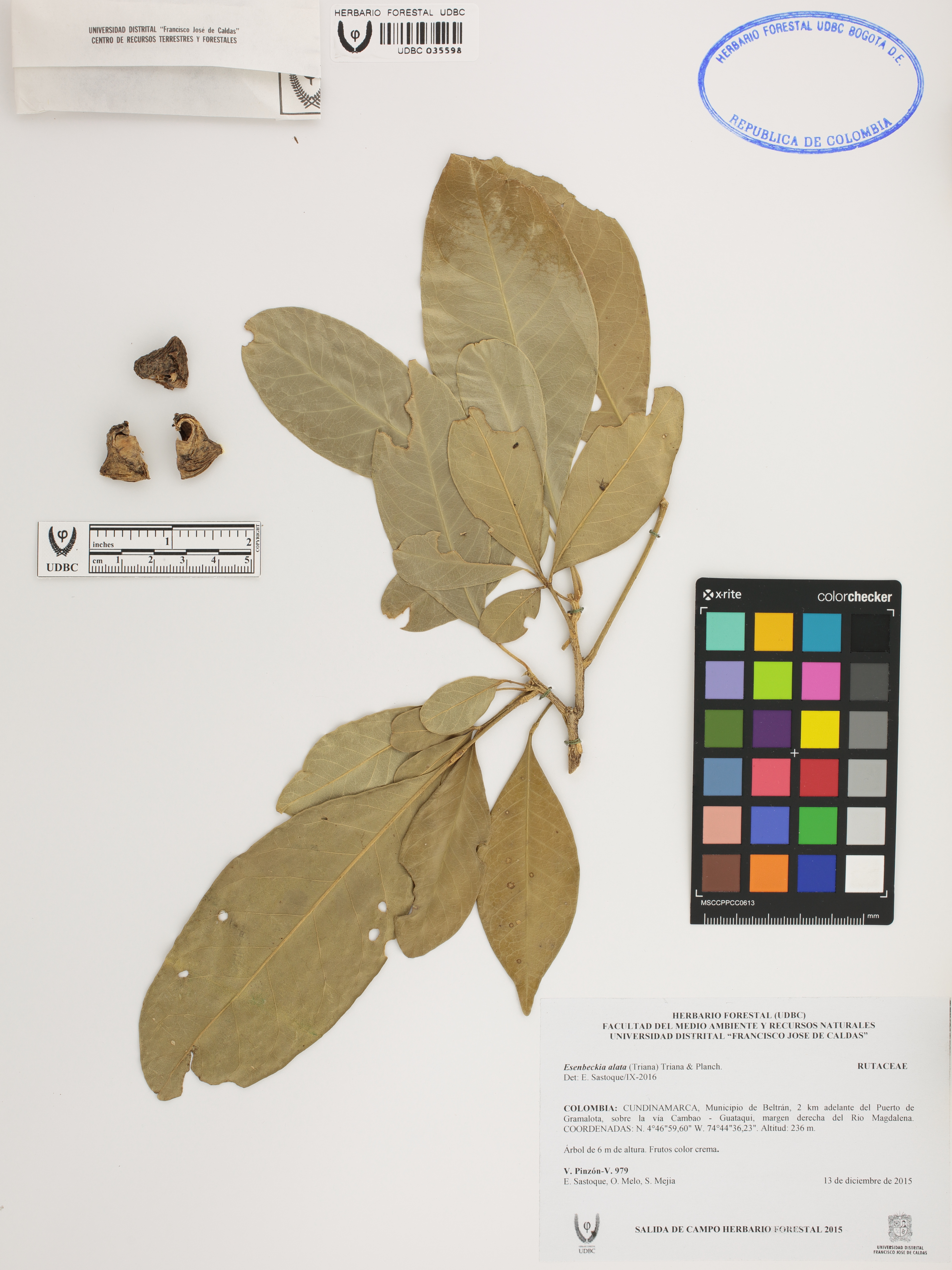 Fotografía del ejemplar Pinzón-V., V. 979, determinado como Esenbeckia alata en el año 2016