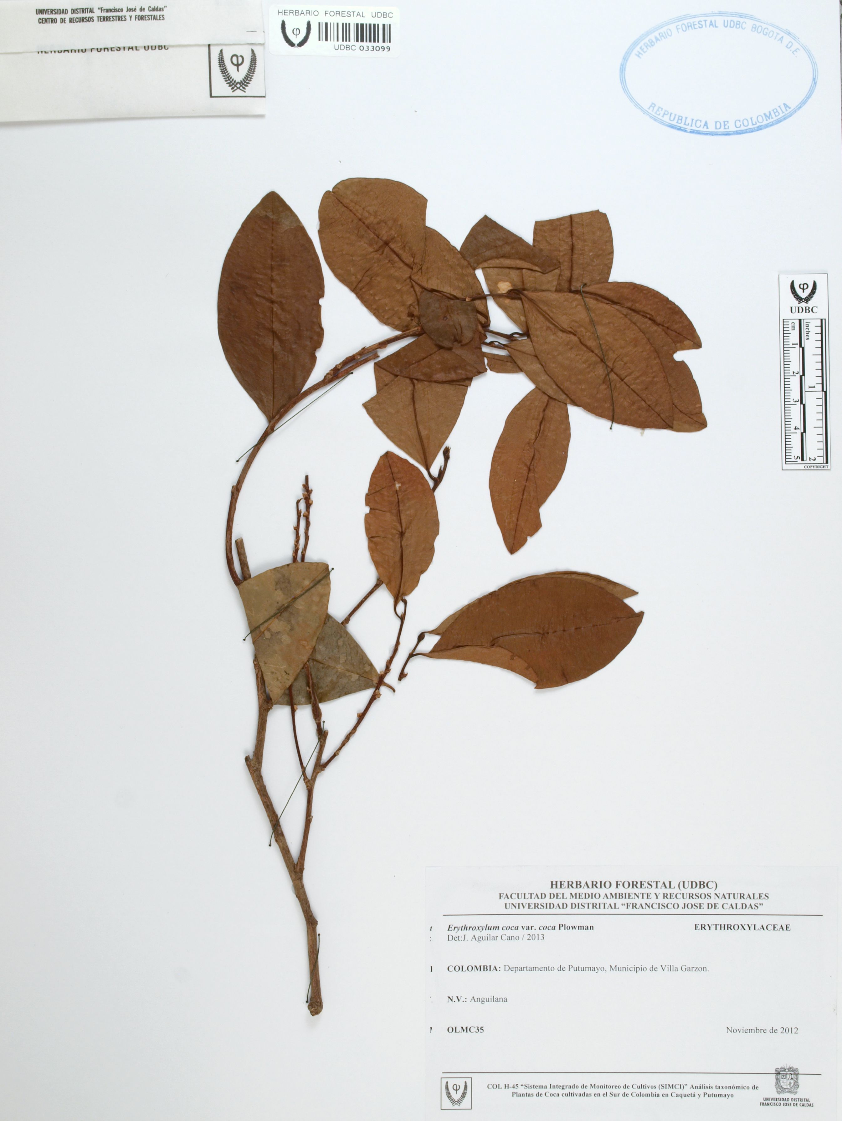Fotografía del ejemplar SD 35, determinado como Erythroxylum coca var. coca en el año 2013