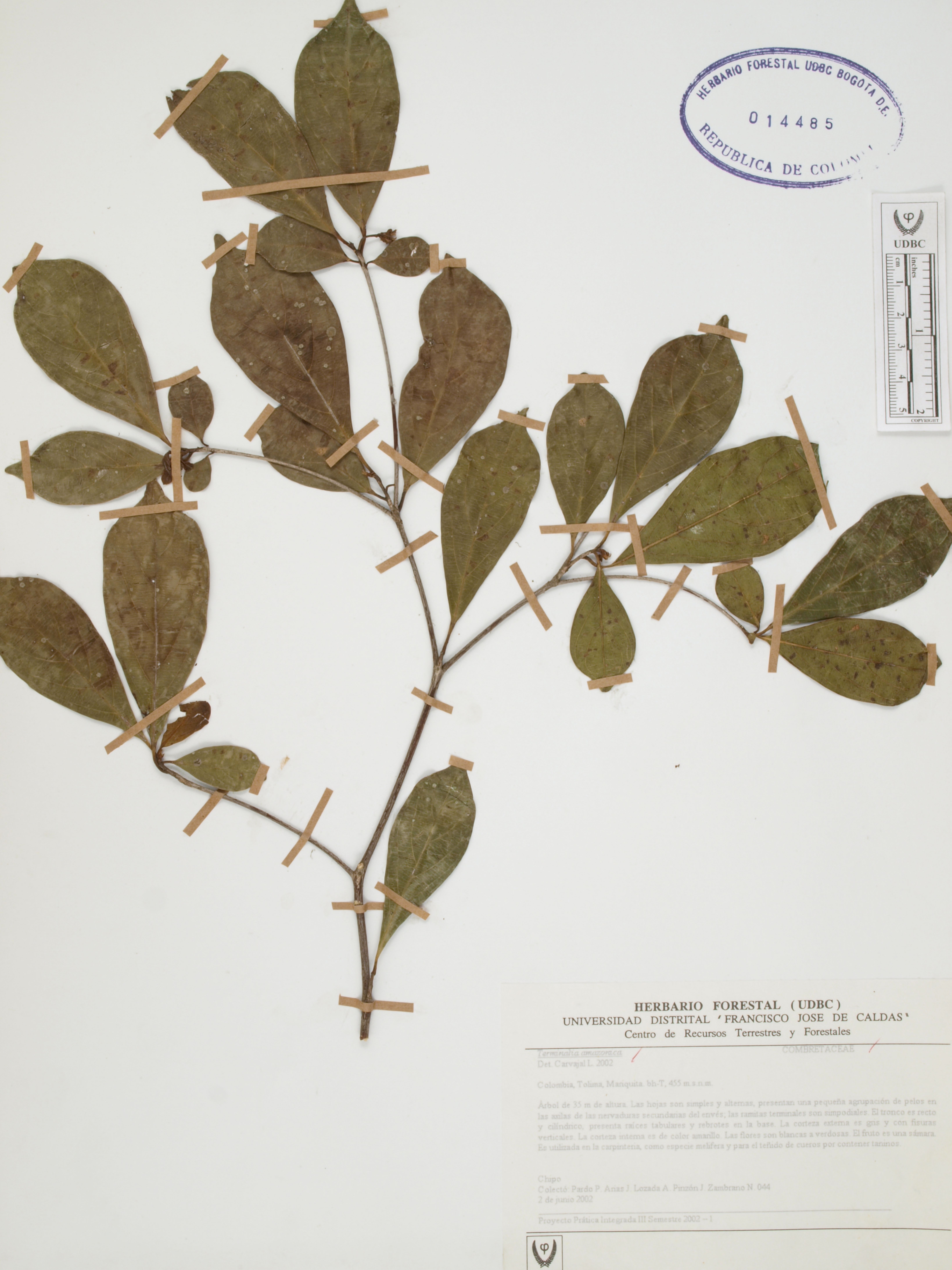 Fotografía del ejemplar Pardo, P. 44, determinado como Terminalia amazonia en el año 2002