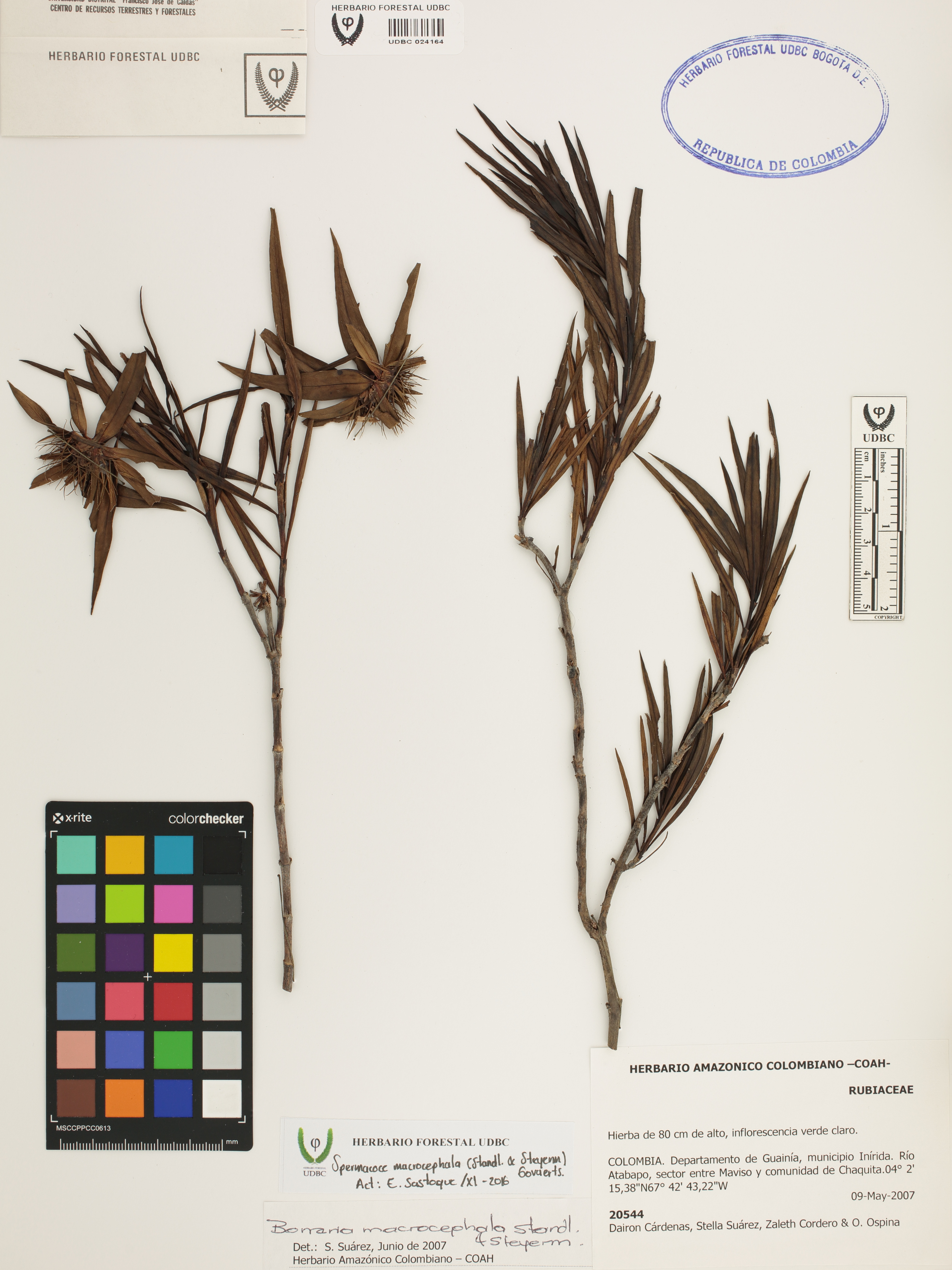 Fotografía del ejemplar Cárdenas, P. 20544, determinado como Spermacoce macrocephala en el año 2007